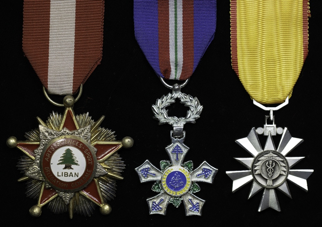 Lebanon, Order of Public Health Merit, 2nd Class, 58mm including suspension x 41mm, silvered metal, scarce; Maronite Church Order, 3rd Class, 71mm including suspension x 38mm, chrome plate; Order of the General Delegation of Arts, Sciences & Sports, 2nd Class, 69mm including suspension x 58mm, bronzed and silvered metal, very fine (3)