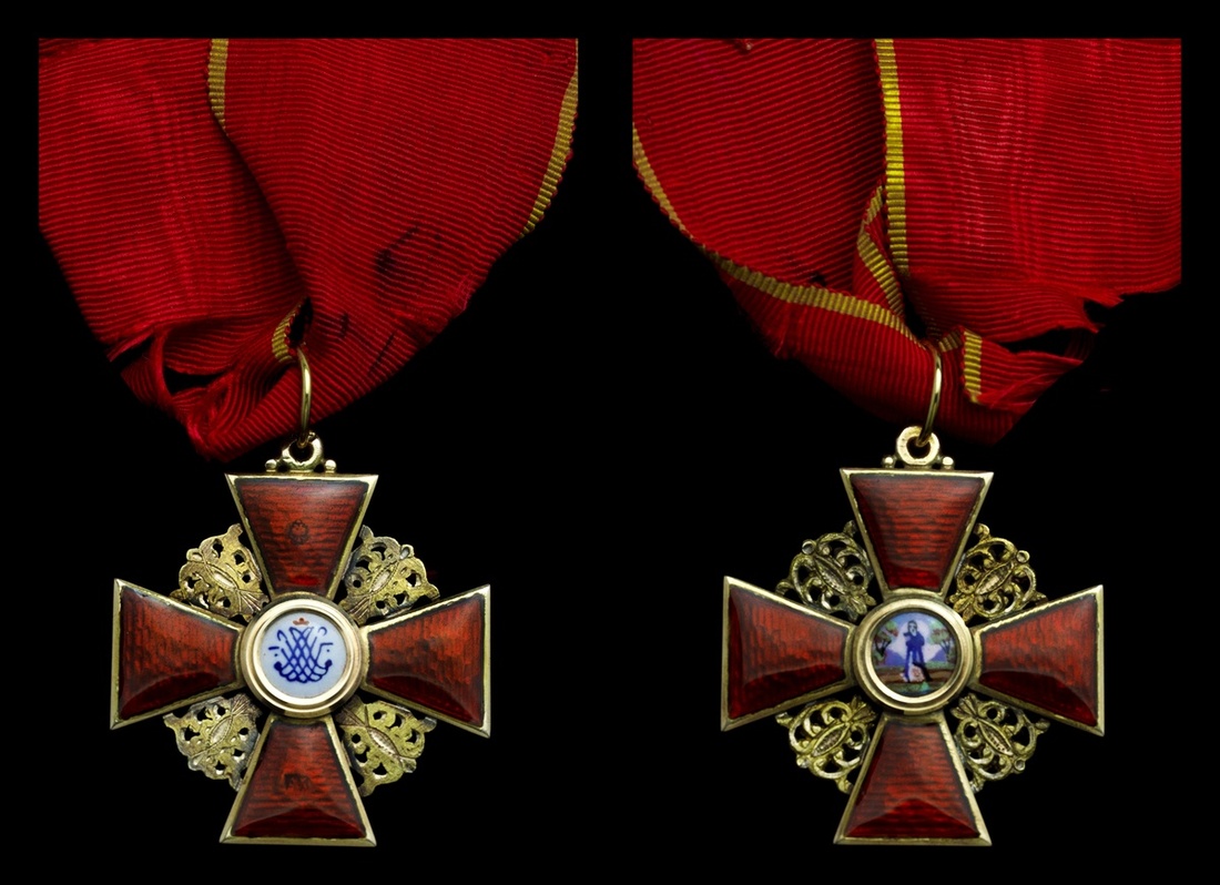 (x) Russia, Imperial, Order of St Anne, breast Badge, by Keibel, 43mm, gold (56 zolotniki) and enamel, maker's initials and court stamp under enamel on reverse, purity mark to loop, replacement suspension ring, good very fine