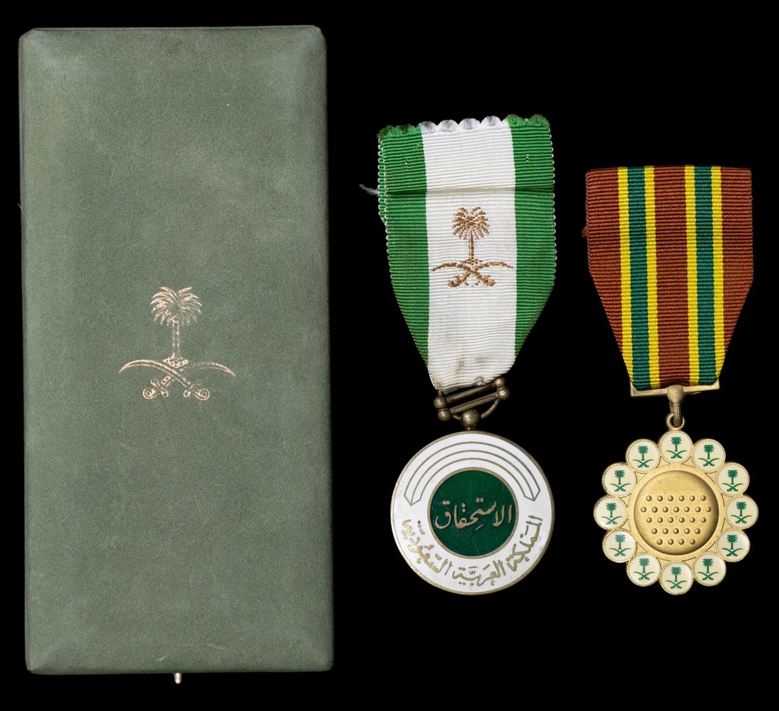 Saudi Arabia, Kingdom, Medal of Merit, 3rd Class, 1971 series, by Bertrand, Paris, silvered base metal and enamel, with riband bar; Combat Medal, by Spink & Son, gilded base metal, some scratches to enamel, otherwise very fine, both cased (2)