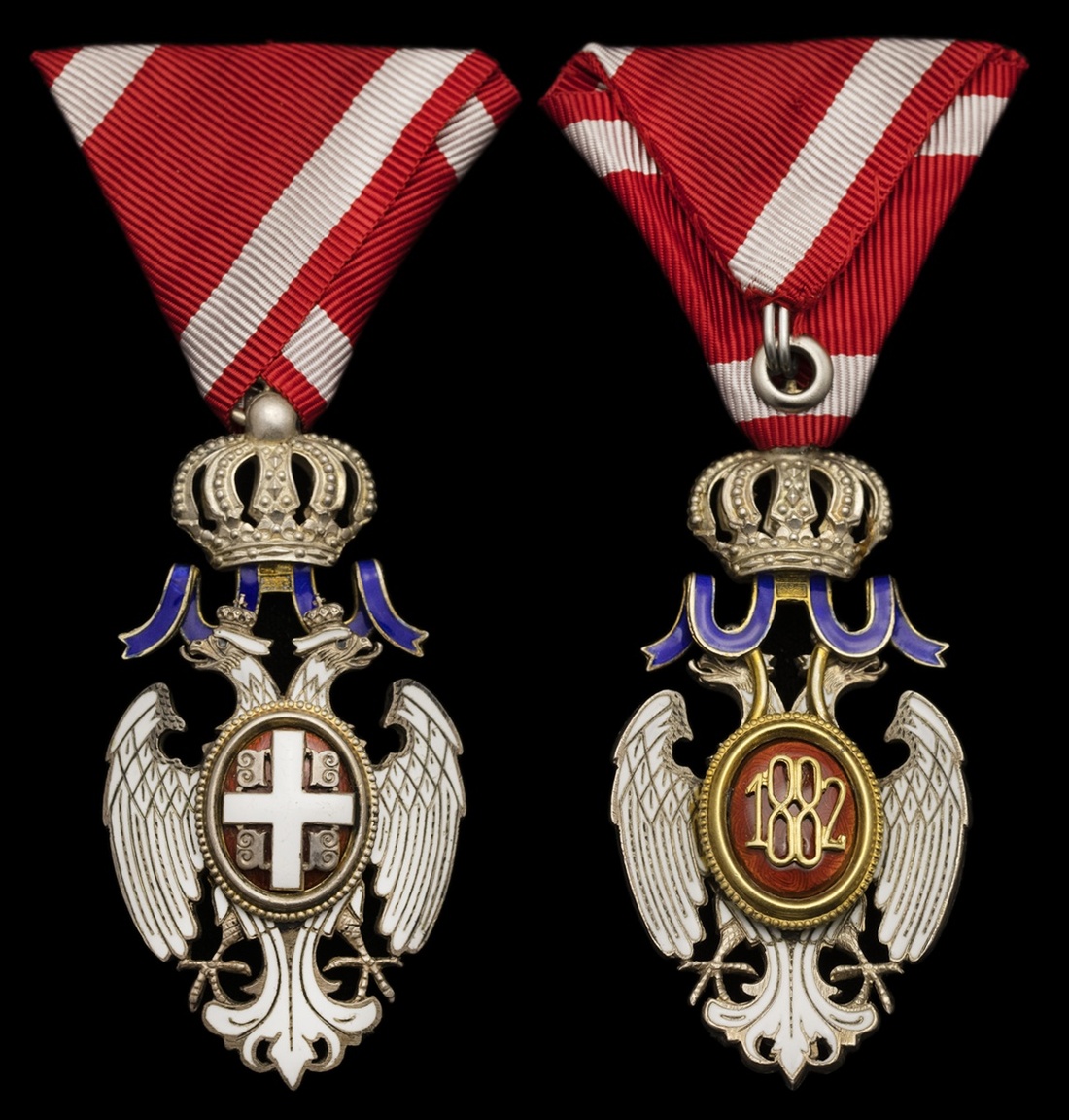 Serbia, Kingdom, Order of the White Eagle, Civil Division 5th Class Knight's breast Badge, Type II, '1882' reverse, 68mm including crown suspension x 34mm, silver, silver-gilt and enamel, minor chipping to enamel on right obverse wing, very fine, in its Huguenin Freres case of issue