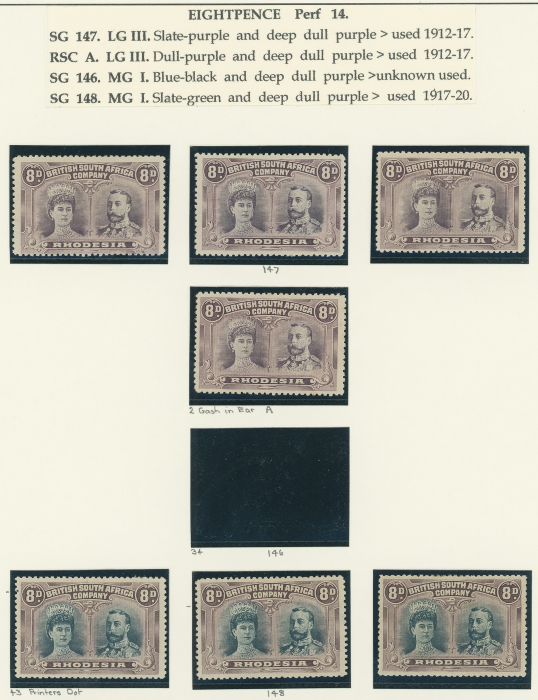 8d. mint group on an album page (7) including a range of listed shades with dull purple and purple, dull-purple and deep dull purple [2] showing gash in ear, greenish black and purple [43] showing printer's mark at upper left, etc. a good to fine group