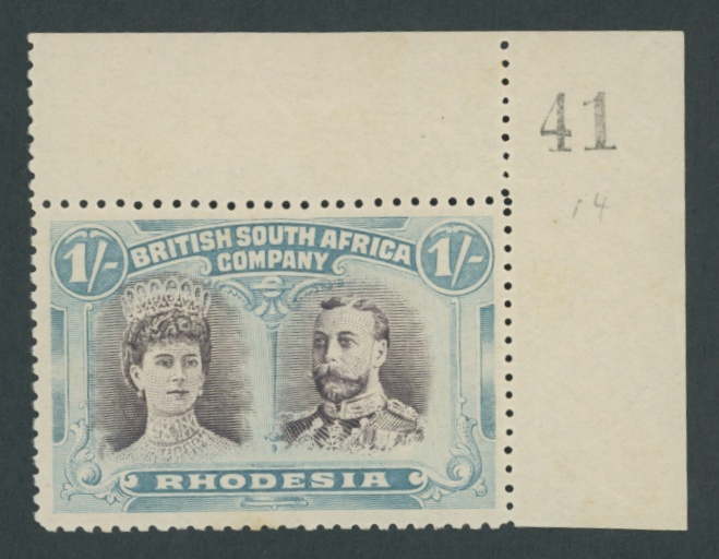 1/- brownish black and turquoise green, long gash headplate, [5] from the upper right corner of the sheet with sheet number '41', almost full original gum, fine. RSC D