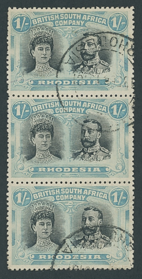 1/- black and bright turquoise-blue, no gash headplate, vertical strip of three cancelled by two strikes of 'Umtali/ 3 Feb 1918'; fine. RSC H