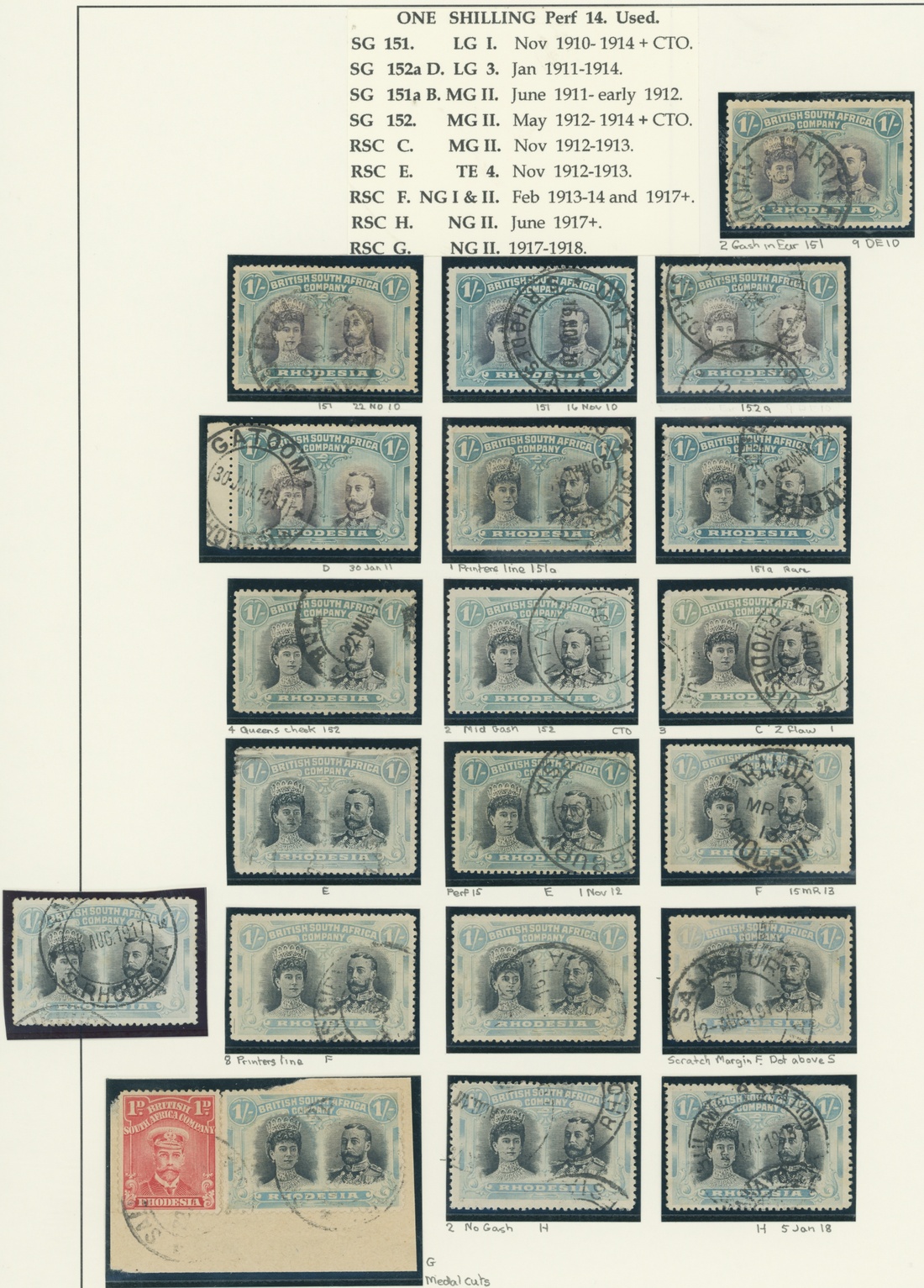 1/- specialised used group on an album page (20) including grey-black and deep blue-green [2] showing gash in ear, black and deep blue-green showing printer's mark at lower left, various other shades and with a variety of cancellations including Umtali, Gatooma, Hartley, Marandellas, Bulawayo Station, etc., good to fine