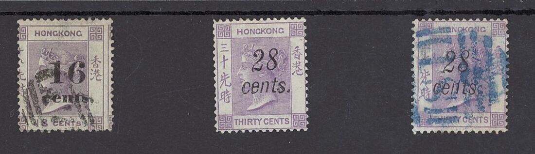 1876-77 28c. on 30c. unused, also 16c. on 18c. used, and 28c. on 30c. cancelled by blue Shanghai "S1" vertical killer cancellation. S.G. 20-21 £2000+