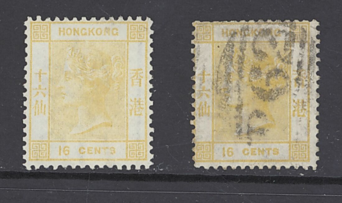 1877 16c. yellow unused without gum and lightly hinged, also a used example with short perfs. S.G. 22 £2000+
