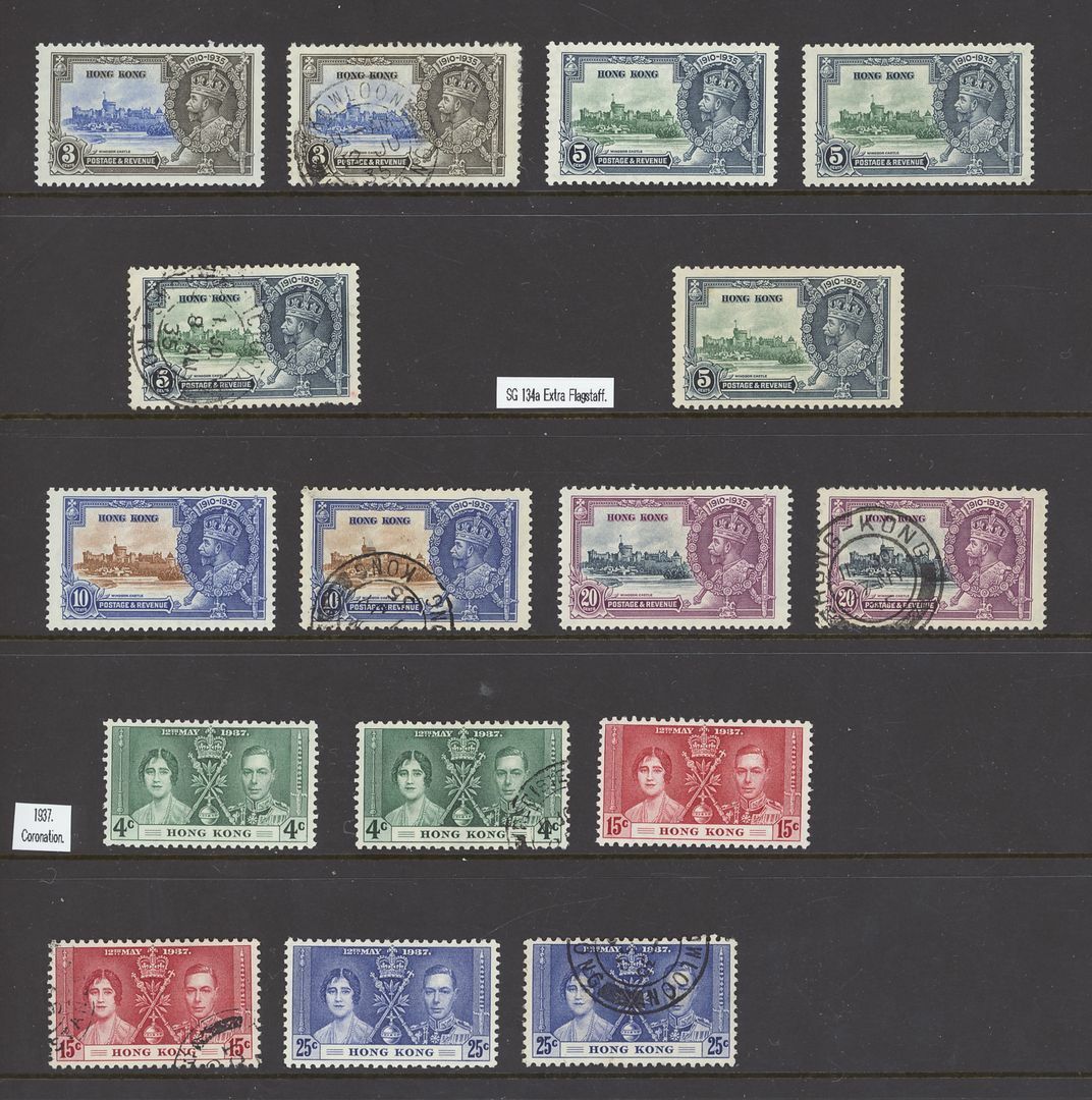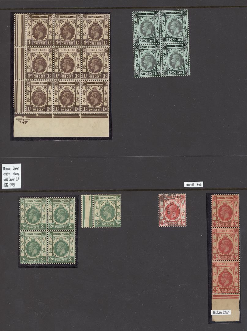 1885-1937 mint and used collection with sets and varieties on hagner pages including 1885-1898 up to $1 on 96c. used examples (25+) with a range of surcharges, 1900-01 2c. to 30c. used set including 2c. with inverted watermark, 1904-06 2c. to $10 used set (with faults), 1912-21 1c. left marginal block of nine showing variety crown broken at right, also 50c. block of four mint; 1921-37 1c. to $5 set with shades, used, 2c. block of four with occasional variety resembling broken crown, 2. mint with margin and inverted watermark, 4c. vertical strip of three with margin at bottom and a 4c. used example both showing variety broken characters, 25c. pairs (3) with sheet numbers showing variety broken flower, 1935 silver jubilee sets (2) including 5c. showing variety extra flagstaff, also 1937 coronation sets used and mint, mixed condition and viewing recommended though an interesting selection with high cat value.