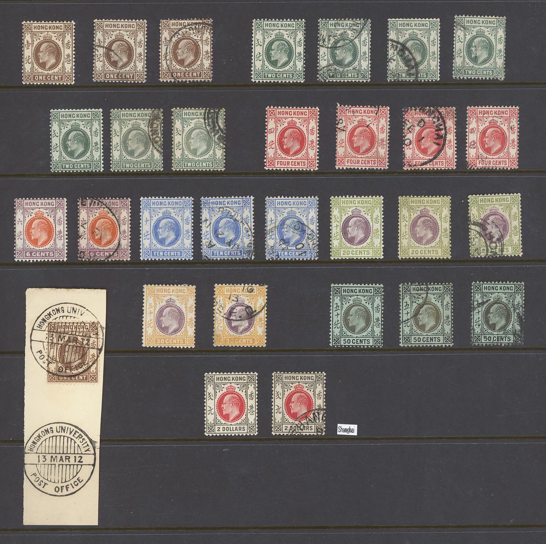 1907-11 1c. to $2 mint and used complete sets of fourteen with additional shades and duplication (30), also 1c. tied to piece by Hong Kong University Post Office d.s (13.03.12), mixed condition with some examples regummed including the $2, still a useful group. S.G. 91 to 99 group