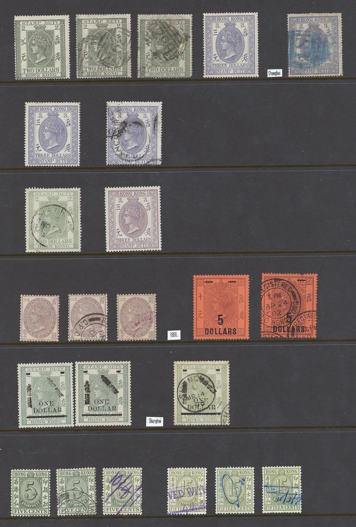 1874-1902 postal fiscal stamps selection (25) including 1874-1902 $2 olive-green (3) one unused, $3 (4), two unused, also one used in shanghai, $2 blueish green used, $3 dull mauve (perf 14) unused, 1890 2c. (3), one unused, 1891 $5 on $10 (2) used and unused without gum, 1897 $1 on $2 (3) two unused, also 1938 5c. unused and used, mixed condition though an interesting lot with high cat value.