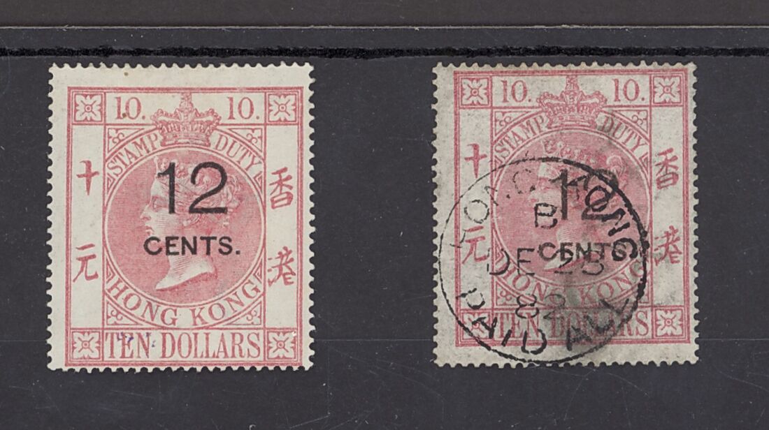 1880 postal fiscal stamps 12c. on $10 rose-carmine, centred to the right, large part original gum, also a used example. S.G. F7 £1,400