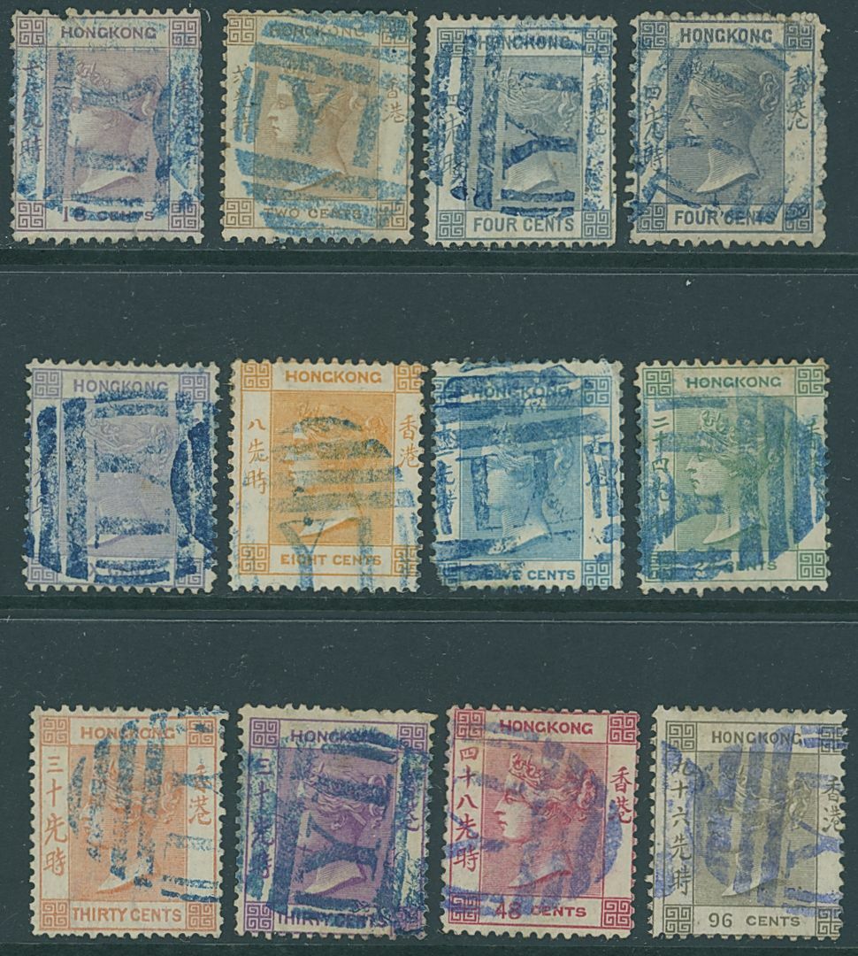 A selection (23) arranged in two stockcards with values up to 96c. stamps cancelled in black (11) or in blue (12), mixed condition.