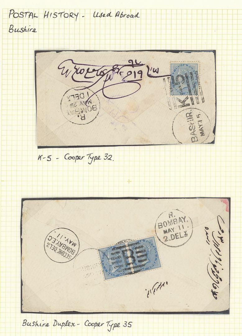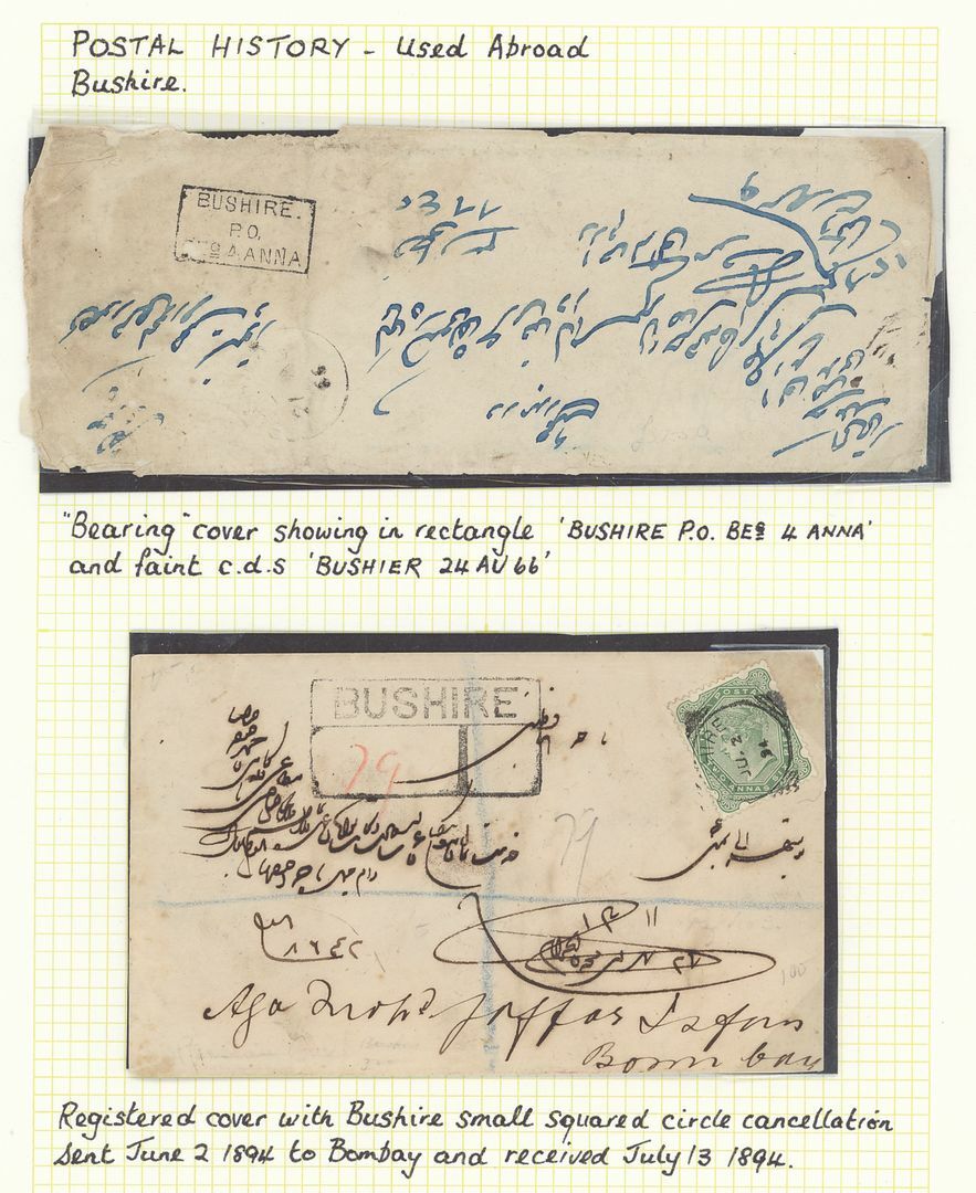Bushire: A group of Q.V. covers with 1866 (24 Aug.) stampless envelope bearing a good strike of the boxed "