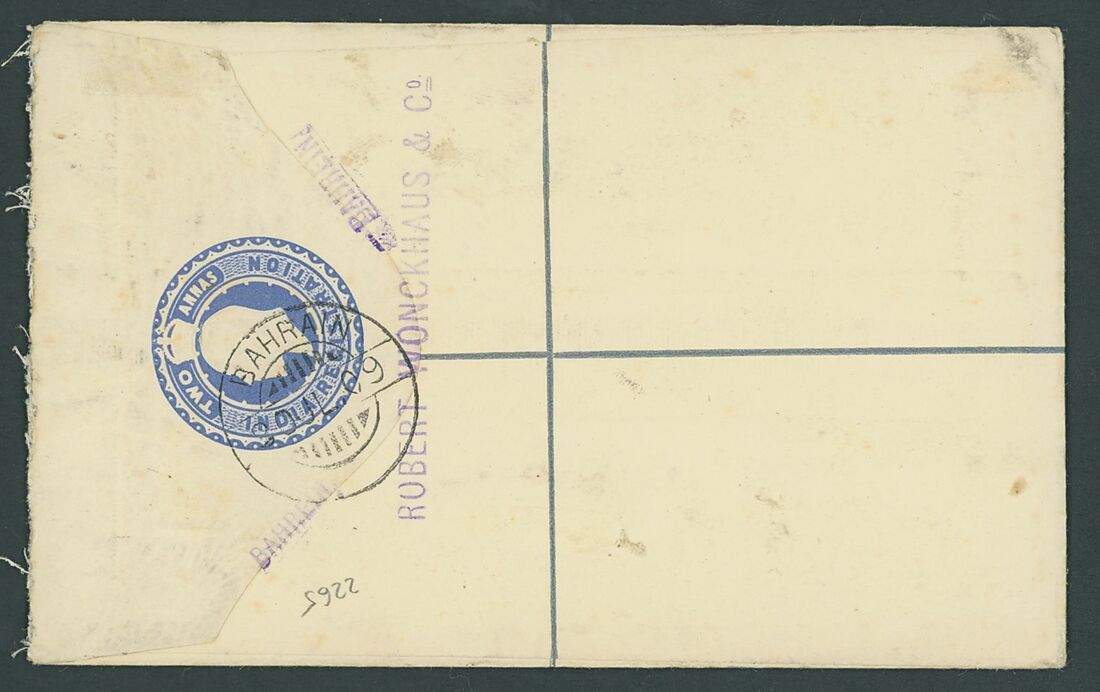 1909 (30 July) 2a. registered envelope size F addressed to Hamburg, Germany uprated with 2a.6p. cancelled by neat Bahrain c.d.s., showing on the front registration label. Fine and scarce. S.G. Z30
