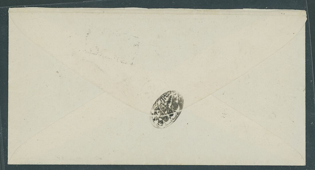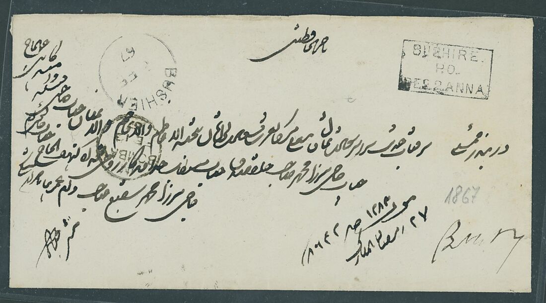 1867 (8 Feb.) stampless envelope addressed to Bombay, India showing boxed bushire/p.o./beg 2 anna handstamp with adjacent despatch c.d.s. and arrival (13.2) c.d.s., fine and scarce.