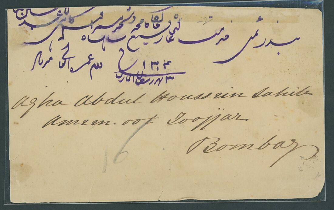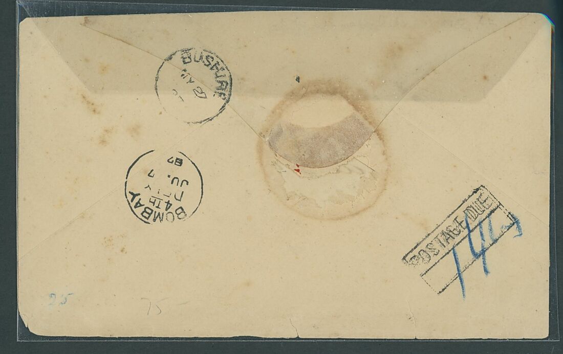 1887 (27 May) stampless envelope from Bushire to Bombay showing small 'Bushire' c.d.s. with adjacent arrival (7.6) c.d.s. and postage due boxed handstamp. Usual minor faults nevertheless a scarce combination.