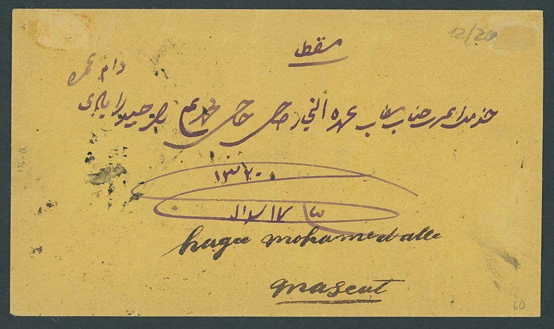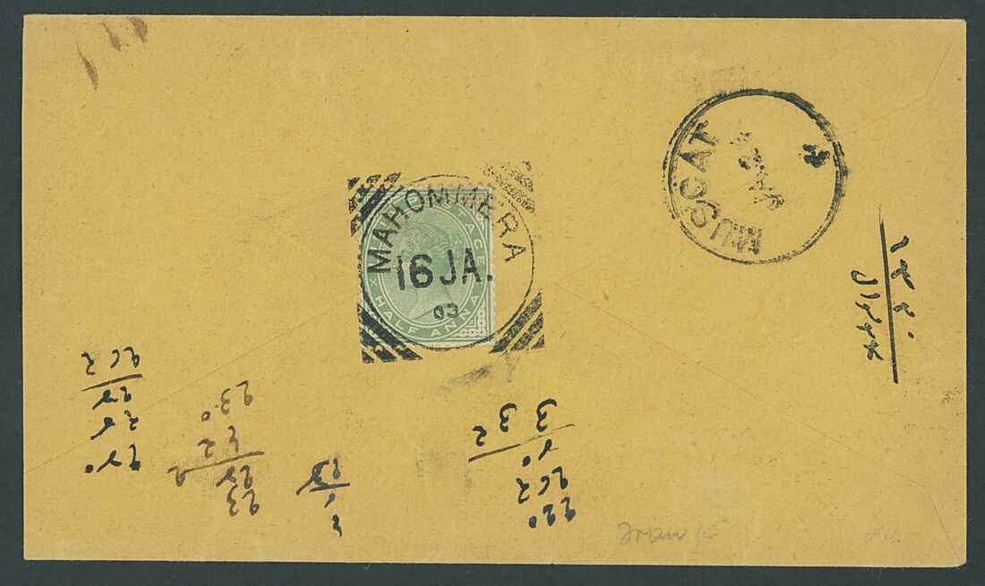 1903 (16 Jan.) envelope from Mohammera to Muscat franked on the reverse with ½a. cancelled by very neat