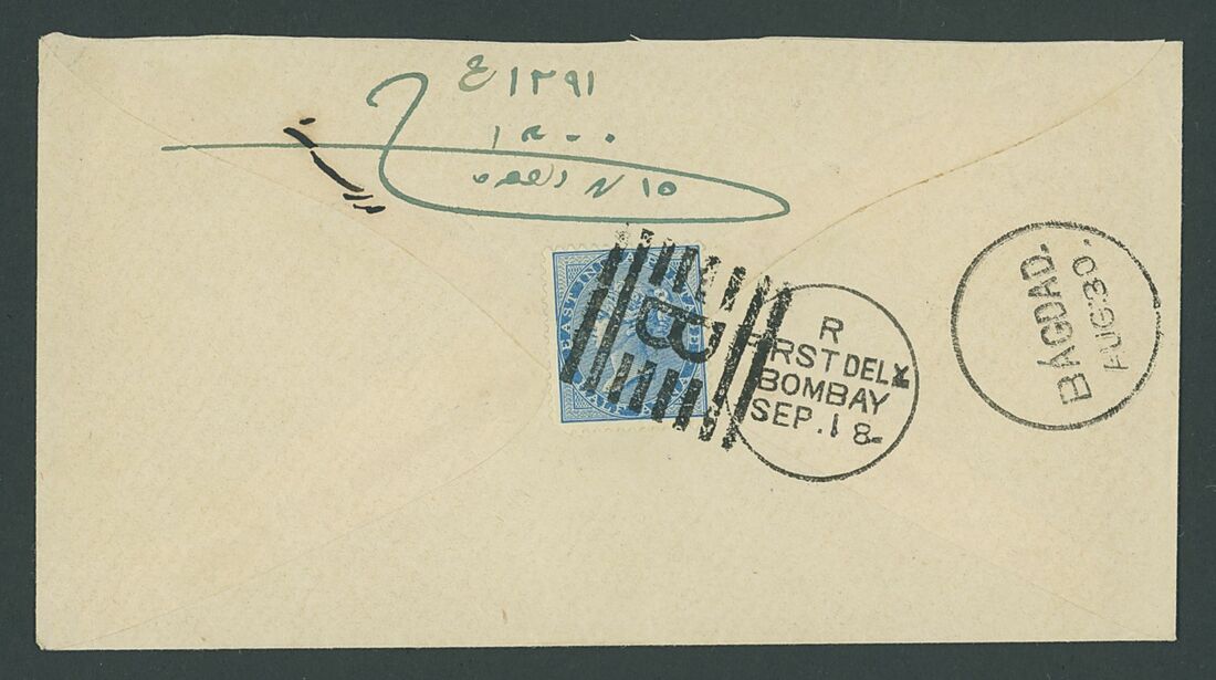 1874 (30 Aug.) envelope from Baghdad to Bombay franked on the reverse with ½a. cancelled by 'B' in eight lines obliterator with adjacent despatch c.d.s. and arrival (18.9) c.d.s. Fine and scarce. S.G. Z11