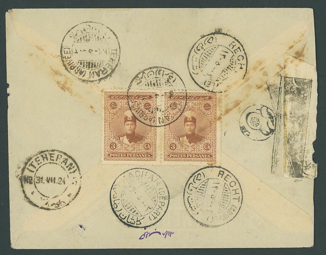1924 local envelope franked on the reverse with 3ch. pair cancelled with local Teheran datestamp and with adjacent Recht and Kachan native c.d.s. and Teheran (31.8) c.d.s. Envelope censored and showing part of the label and special censor cachet. Some staining not disturbing the overall appearance, a scarce censored cover.