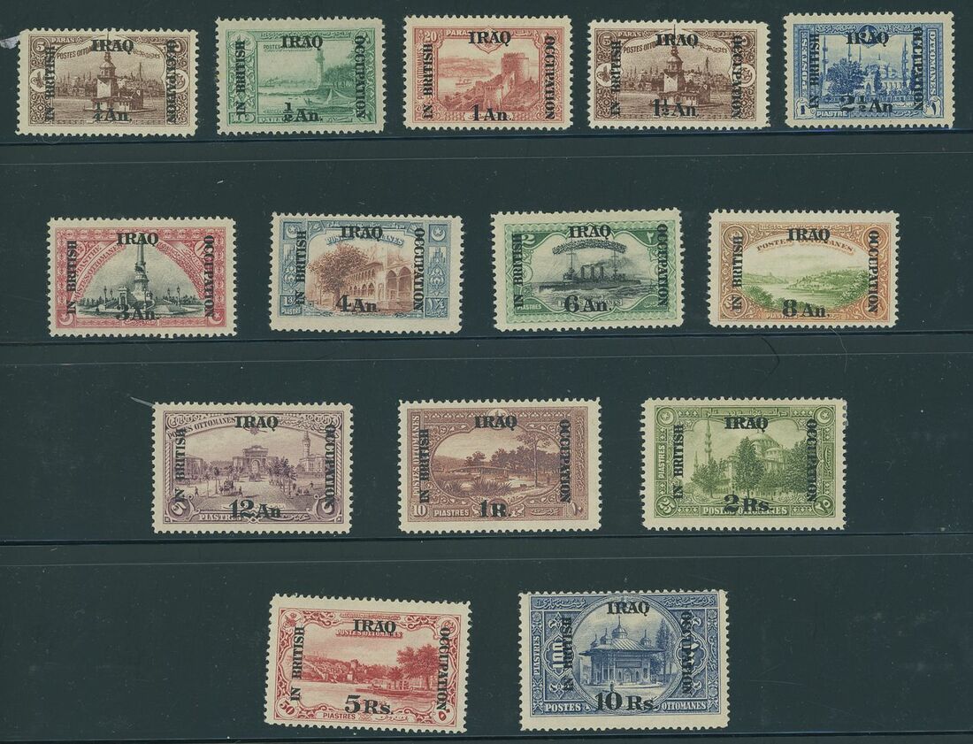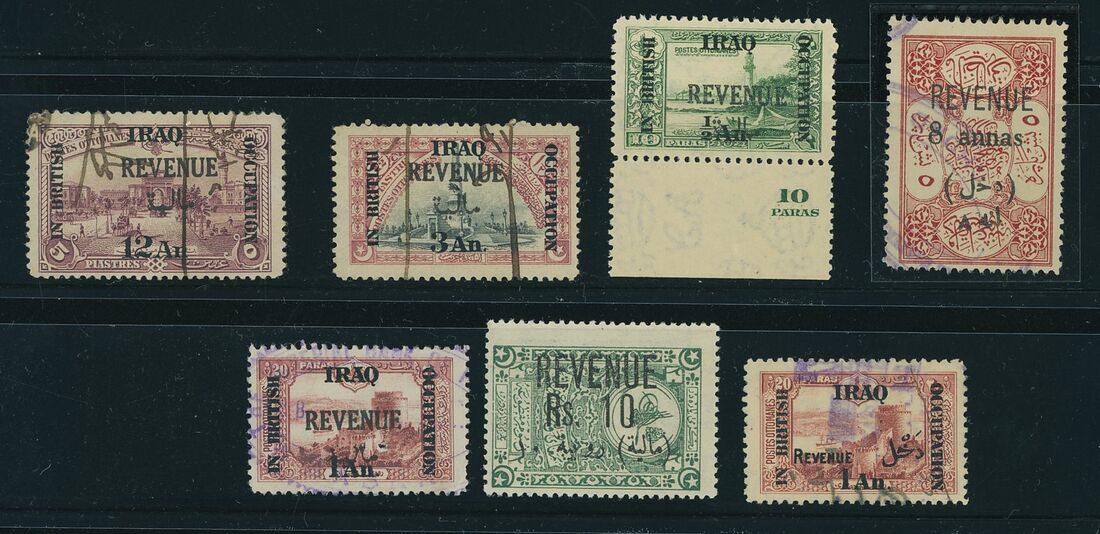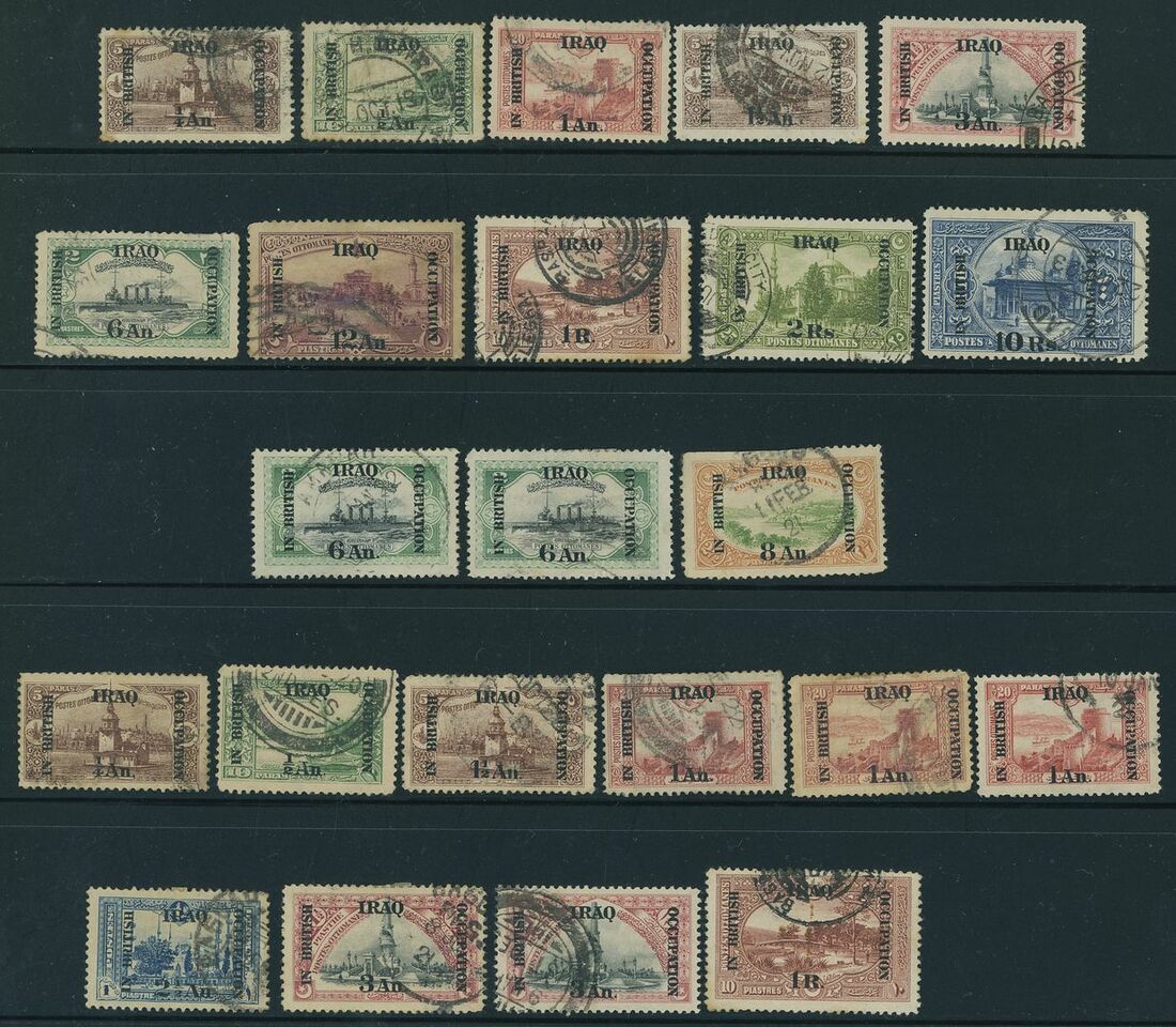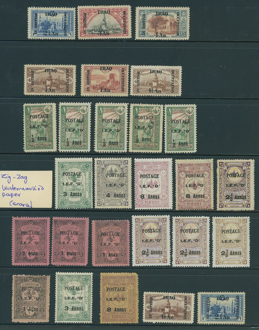 Selection on stockpages (100+), including Issues for Mosul 1919 3a. on 20pa. (3), 4a. on 1pi. (4) and 8a. on 10pa. (4) watermark steps, Issues for Iraq 1918-21 5r. on 50pi. and 10r. on 100pi., 1920-23 Official 5r. on 50pi., Revenues, etc., chiefly fine