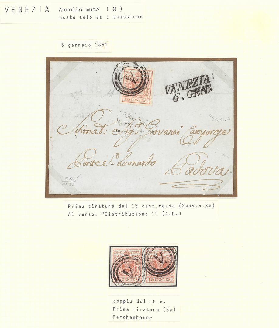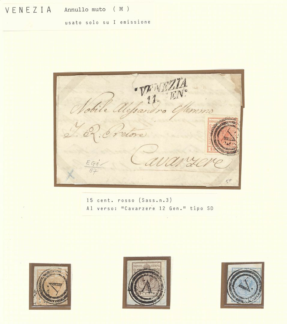 1850 "Muto di Venezia" (Venice "V." dumb cancel) selection including 5c., 15c. (4, two examples on two different covers and a loose pair), 30c. and 45c., an attractive group of this popular cancel .