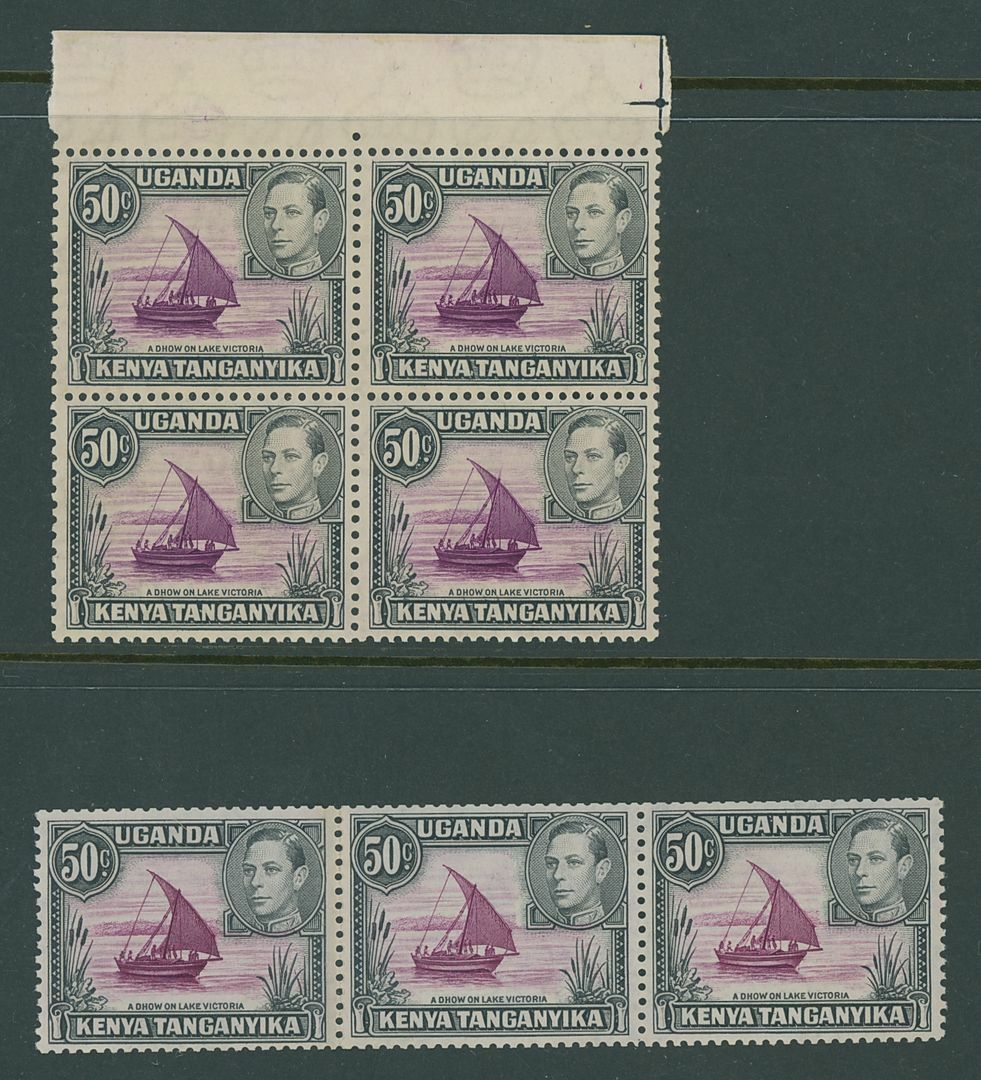 1938-54 50c. purple and black, perf. 13 x 11¾, block of four from the top of the sheet, the last stamp the {R2/5] "Rope not joined to sail" variety, perf. 13 x 12½ 50c. horizontal strip of three, including pair, with and without dot; mint, the first a little gum stained, the second with vertical gum bend; fine. S.G. 1444, 144a, 144e, 144eb, £990+