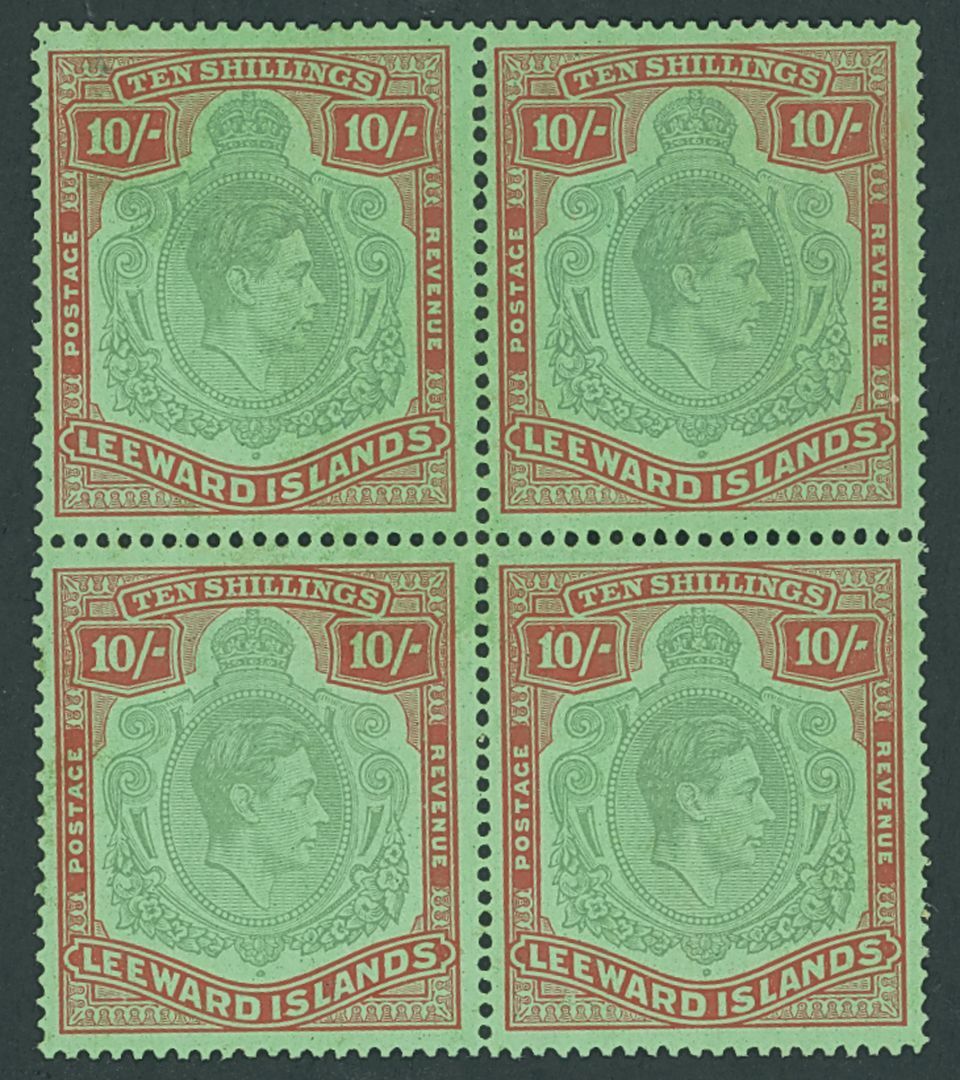 1938-51 10/- bluish green and deep red on green, block of four; full original slightly toned gum. S.G. 113, £800+