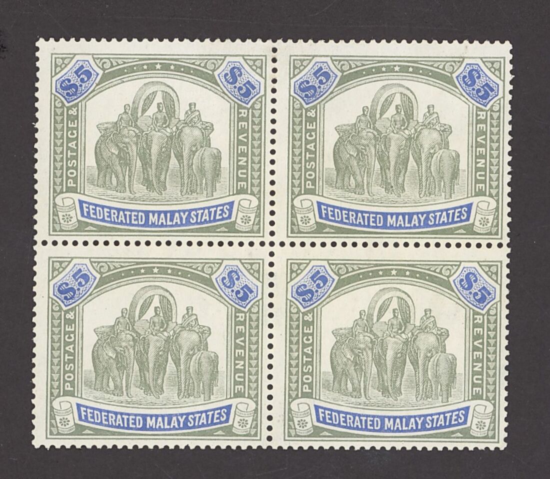 1922-34 $5 green and blue block of four, unmounted mint, a useful multiple. S.G. 80 £900