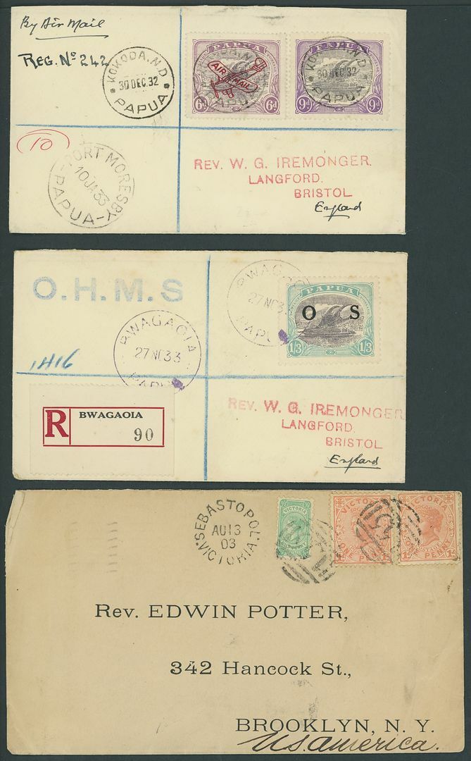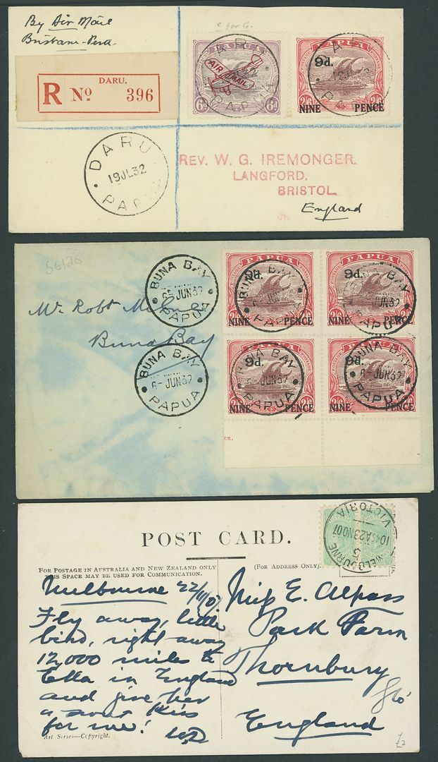 1929-39 postal history selection (8, seven registered) including from Toma (2), Daru (2), one bearing 1930 Air Mail 6d. variety
