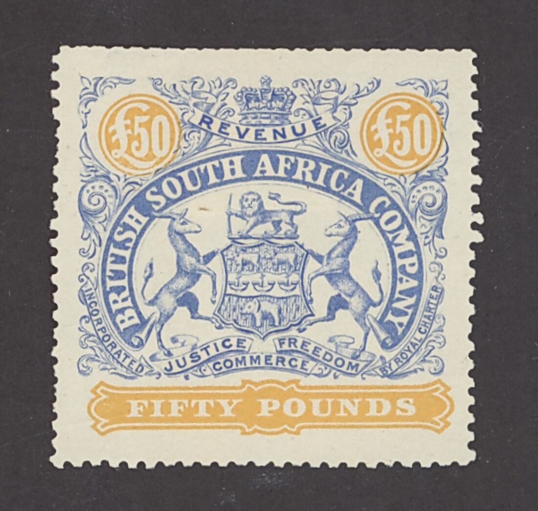 1896 Revenue £50 blue and orange, trimmed perfs. at top otherwise fine; large part original gum. Barefoot 8