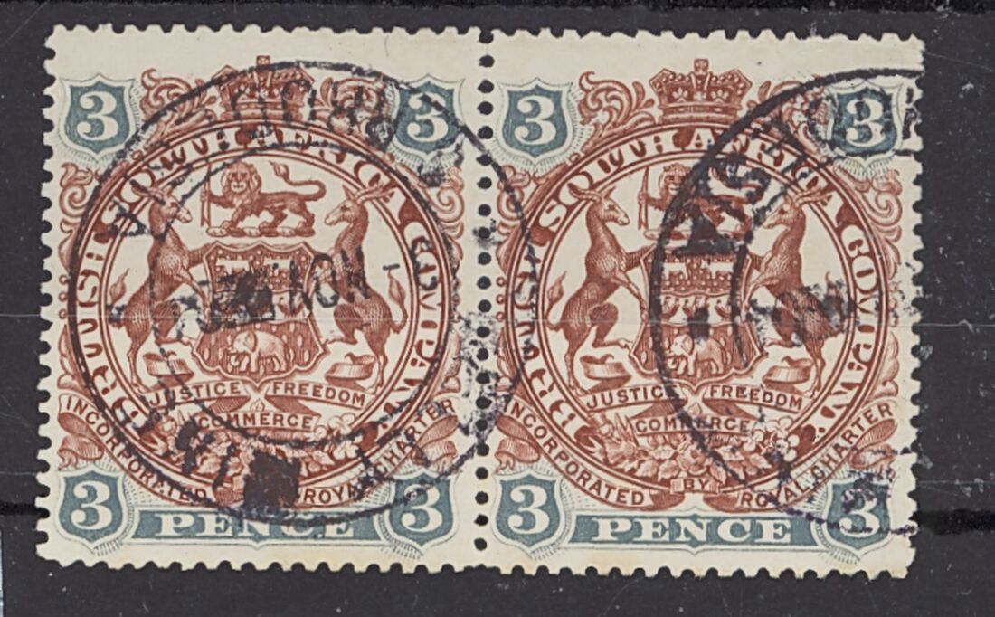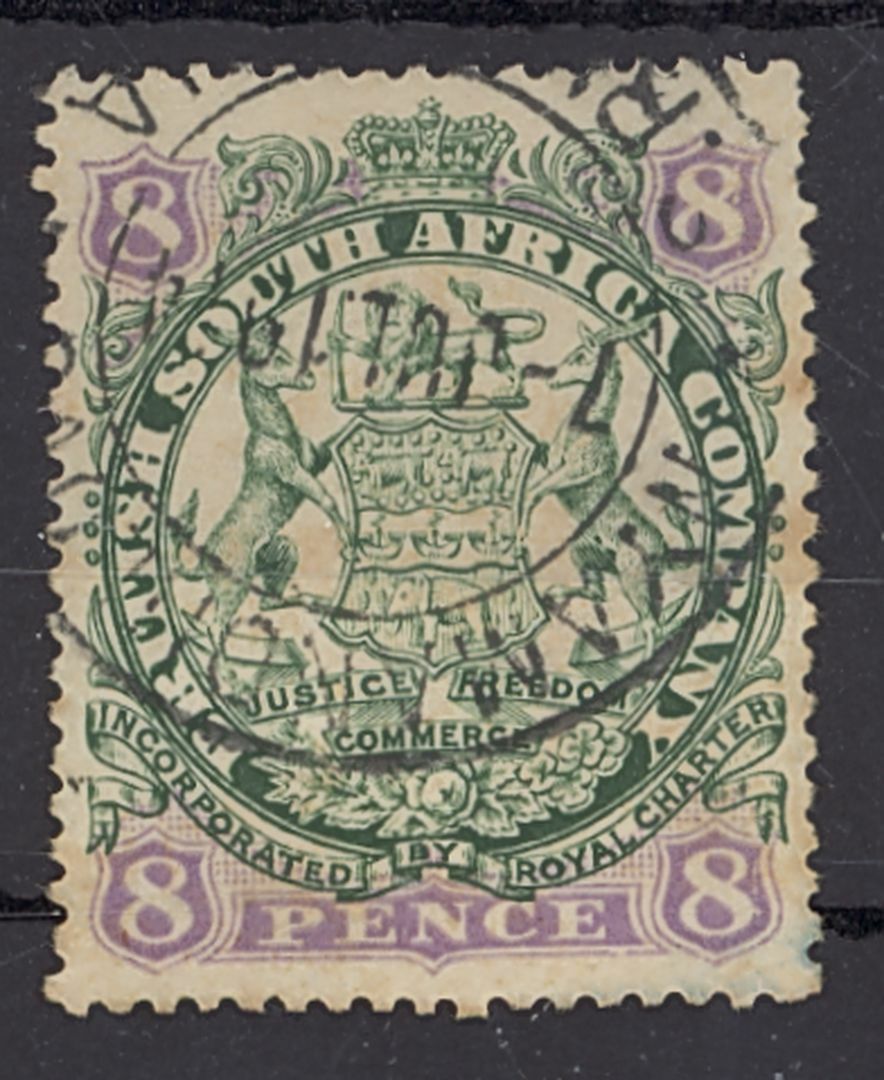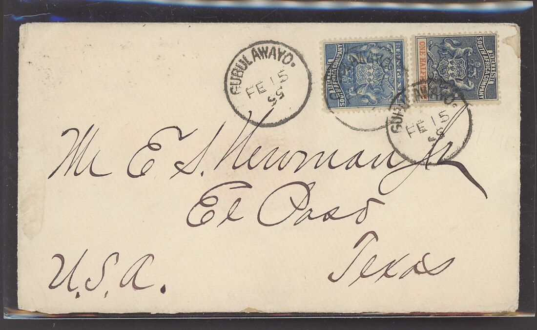 A selection on stockcards used in various locations including Gubulawayo 1895 (15 Feb.) envelope to U.S.A. bearing Small Arms ½d. and 6d. tied by Gubulawayo c.d.s. with Bechuanaland removed and showing "5" in year inverted, the reverse with Cape Town, New York (23.3) and El Paso arrival (28.3) datestamps, 1904 (3 Nov.) variety blank before two figure year, superb strikes of the Nelly Mine double-circle on 1897 3d. pair., Used in Nyamandhlovu includes 1907 (10 Aug.) variety blank before two figure year, a complete strike on Small Arms 1d. on piece; also 1914 (7 July) double-circle strike on 1896-97 8d., Veracity skeleton c.d.s. on Small Arms 1d. with 1902 (19 Sept.) single and 1904 (3 Nov.) on pair; a useful group. (7)