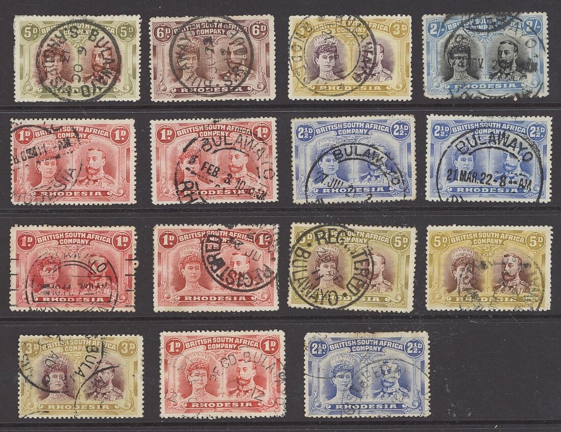 A collection on stockcards all used in Bulawayo with a range of cancellations comprising single-circle with day month 1913 (6 Oct.) on 5d. lake-brown and olive, perf.15, B63 (rare); month day 1912 (22 June) on 6d. red-brown and mauve B64 (rare), 1911 large double-circle with date errors, including date error "0" followed by large and small blanks on 1d., B77 (unique); (23 May) with year "2" on 2/- black and dull blue (small corner split), B79 (rare); (5 Feb.) with yeardate "3" on 1d., B79A (rare); also double-circle with stars, 1911 (21 Mar.) on 3d. purple and yellow-ochre (one pulled perf.), B65 (rare); 1921-22 different types of the large double-circle with 1921 (27 July) on 2½d. dull blue, B104C (extremely rare) and 1922 (20 Mar.) on 2½d. chalky blue, B104D (extremely rare), Krag Machine; 1911 (3 Oct.) with blank after day on 1d., B111 (2 recorded), registered cancellations include 1911-12 a group of the scarce single-circle c.d.s. with 1911 (29 Sept.) day month on 5d. purple-brown and olive-green, a superb strike, B113 (very rare); month day with 1912 (22 June) on 1d. and on 5d. purple-brown and olive-yellow showing variety month inverted, B115 (the two recorded examples), 1913 skeleton c.d.s. with (2 Aug.) day month in jet-black viscous ink on 3d. purple and yellow-ochre, B117A (unique); month day variety month and year omitted, B122 (unique), 1923 (22 Oct.) double-circle c.d.s. on 2½d. dull blue, some short perfs. at top, very late use of a Double Head. B125 (2 recorded), generally fine, a useful and rare group. (15)