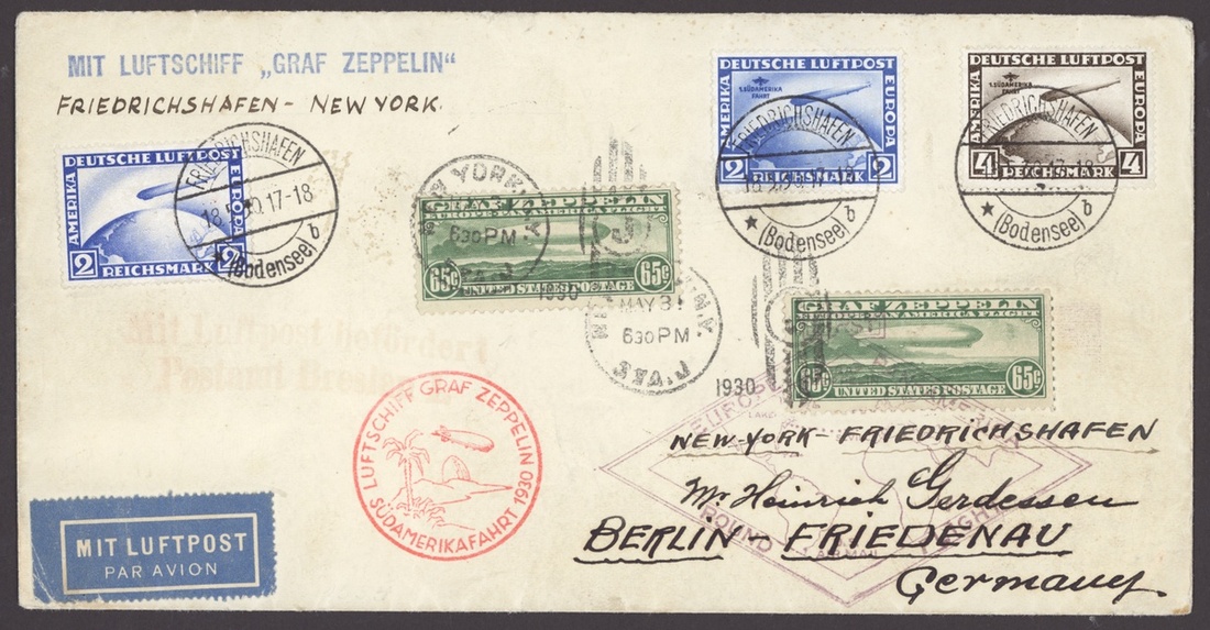 1930 Pan-American Flight, striking combination franking for the round trip with two German 2M. and a 4M. South America Flight Zeppelin singles tied to cover paying only 8M (rate was 10M) to the United States, tied by "Friedrichshafen/(Bodensee)/18. 5. 30" c.d.s., red German flight cachet, backstamped Lakehurst, then two U.S. 65c Zeppelin singles tied by "New York, N.Y./Sta. J/May 31, 1930" duplexes for the return flight with violet American return flight cachet, backstamped Friedrichshafen, a rare and unusual round-trip cover using these two countries' Zeppelin franking to pay the postage.