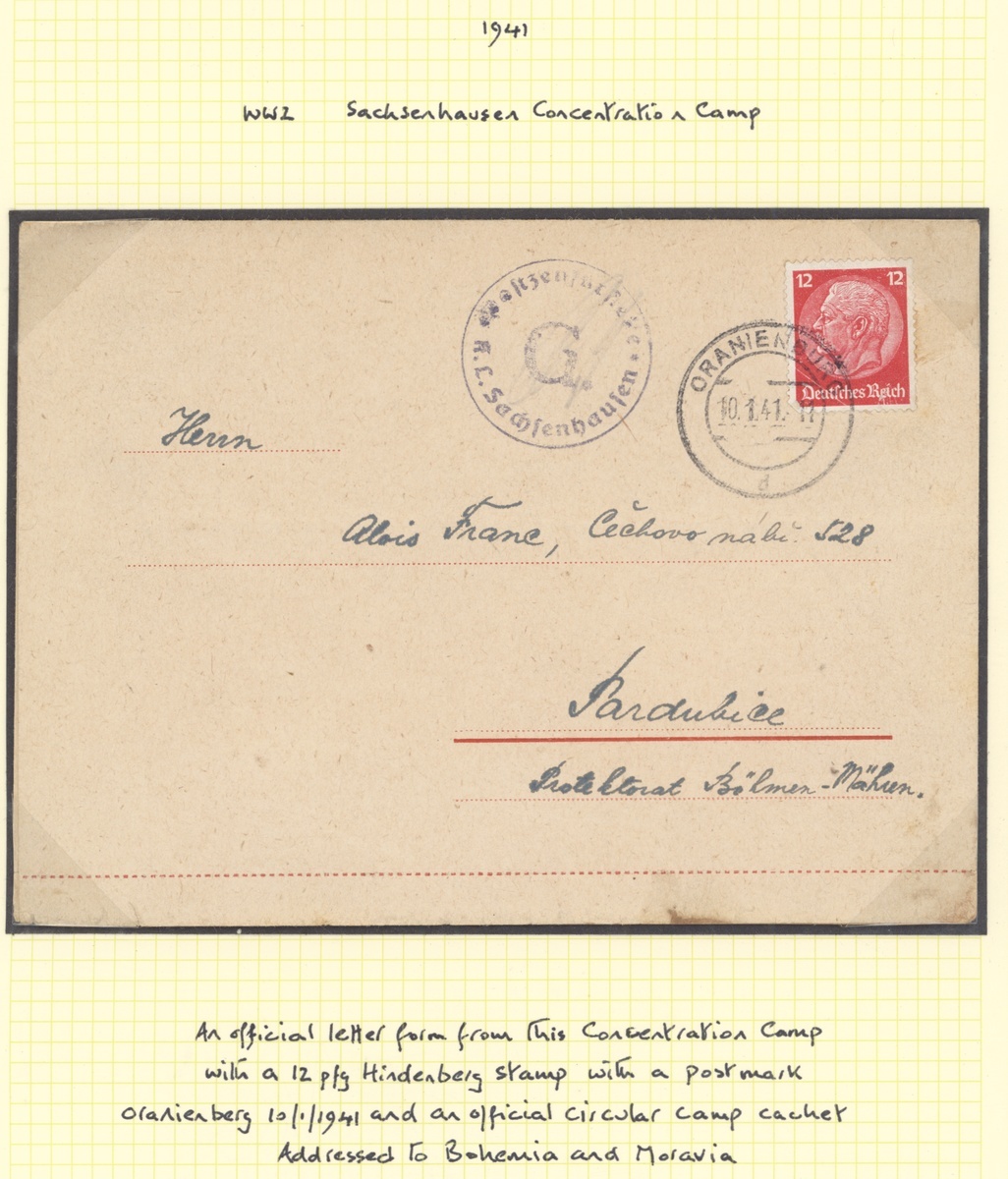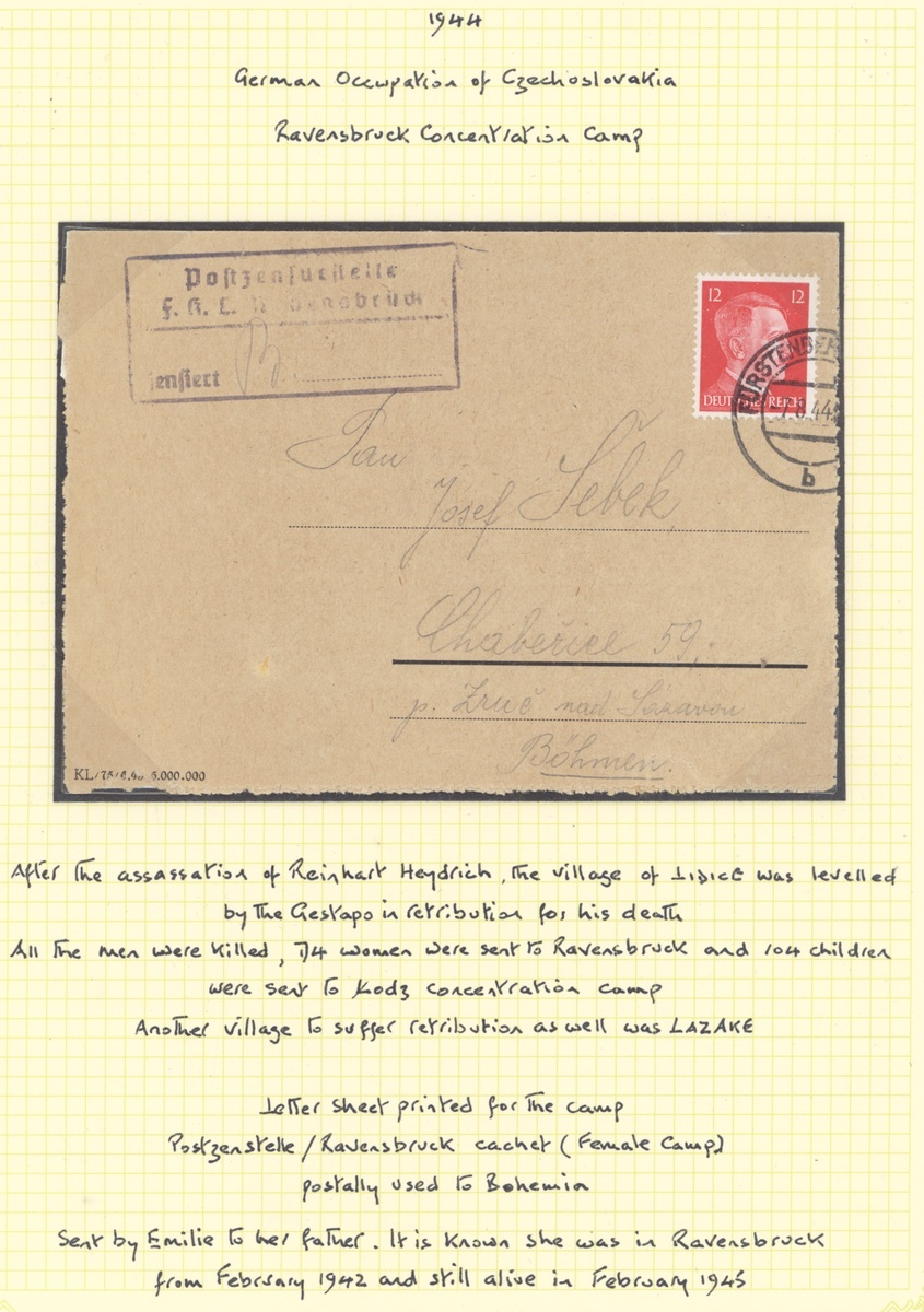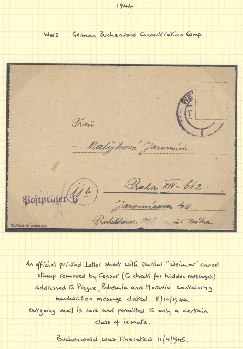 1941-44 Concentration Camp letters (3) with 1941 from Sachsenhausen to Pardubice, Bohemia and Moravia, 1944 from Buchenwald also to Bohemia and Moravia ( stamp removed to check for hidden messages) and 1944 from Ravensbruck to Bohemia; also two unused silk cards; 'To My Sweetheart' and 'Forget Me Not'; a fine group