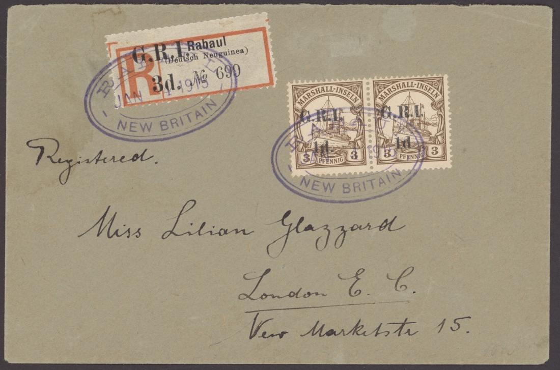 1914 (16 Dec.) 1d. on Marshall Islands 3pf. brown pair used and tied to philatelic cover to London with 'Rabaul 3d. Registration' label alongside, all tied by two strikes of