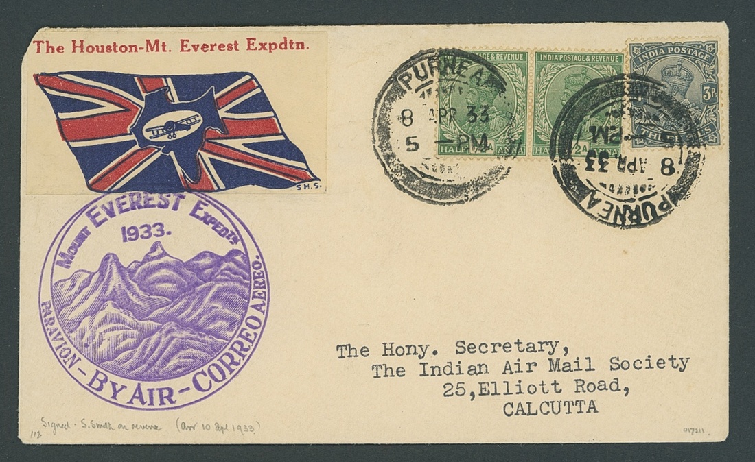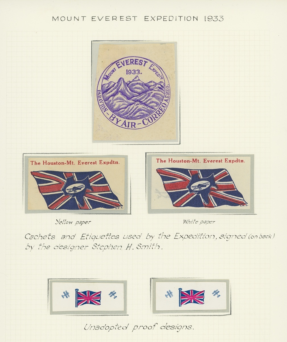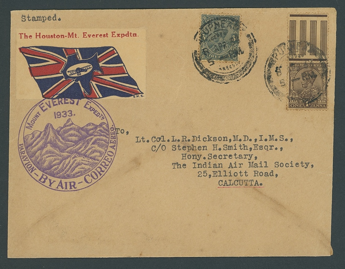 1933, The Houston Mt. Everest Expedition, two flown covers to Calcutta, each with additional 1a. 3p. frankings (made different ways), with the special violet cachets tying the souvenir vignette (only 87 covers flown), also included is a strike of the special cachet on a piece, two examples of the vignette (white and yellow papers) and two example of an unaported Essay for the vignette, 1931 "First Flight/India's Congratulations souvenir cover to Bangkok, and a wonderful array of collateral material concerning the expedition including "Nanda Devi" pamphlet by Charles S. Houston signed by the author, six contemporary newspaper clippings with the violet cachet and much other fascinating material