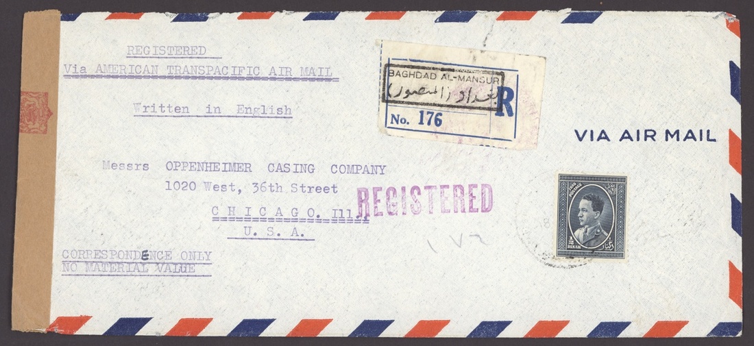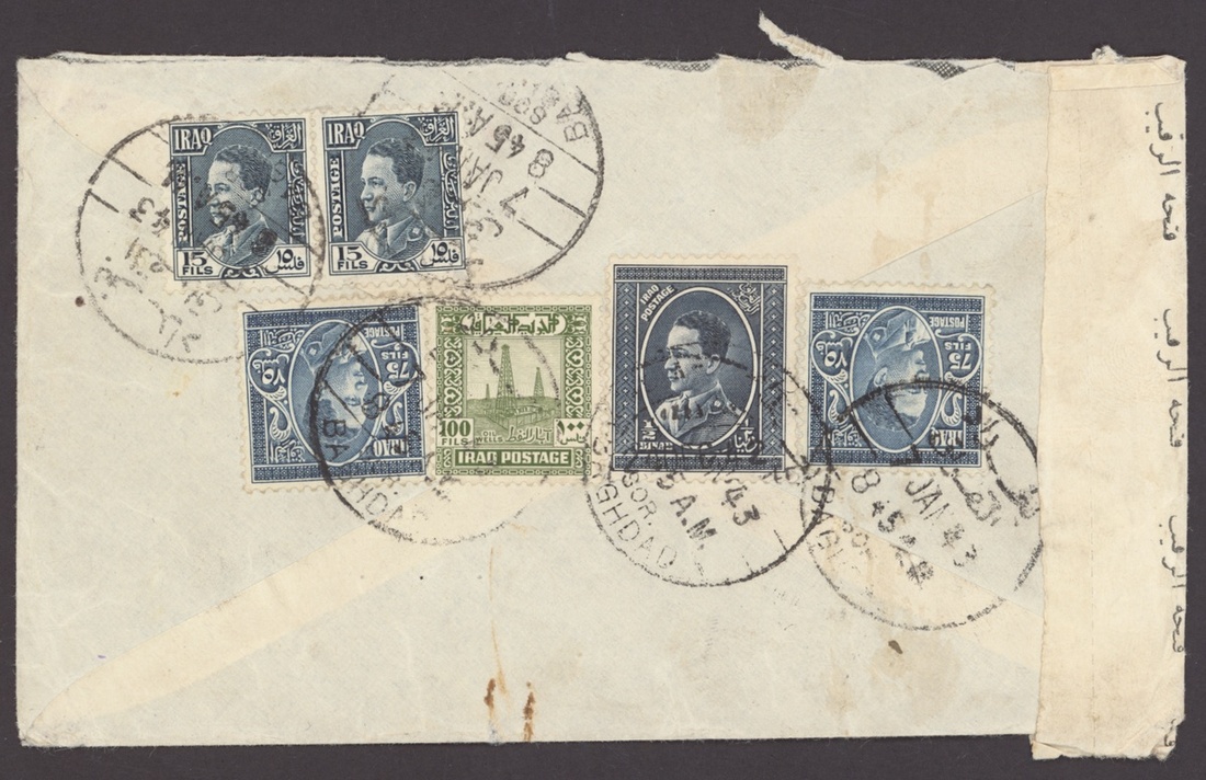1934-38 King Ghazi 15f. (pair), 75f. (2), ½d., with King Faisal II Oil Wells 100f. on Censored cover to New York, 1934-38 KIng Ghazi ½d. on Registered and Censored cover to the United States; fine. Two scarce Air Mail frankings
