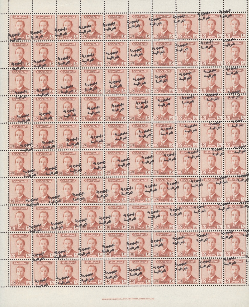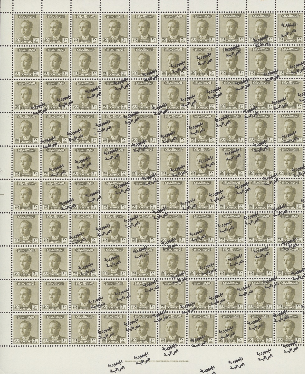1958-60 "Iraqi Republic" on 1954-57 40f. chestnut, on 1957-58 6f. carmine-lake and 20f. olive-green, each in a complete sheet of 100 and all with misplaced overprints, the 40f. with overprint diagonal resulting in the lower left horizontal pair being with and without overprint, the 6f. with 10 stamps showing double overprint, the 20f. diagonal overprint resulting in 20+ without overprint. Unmounted mint, minor bends or creases, fine. S.G. 438, 448, 451vars.