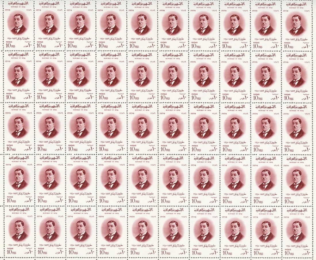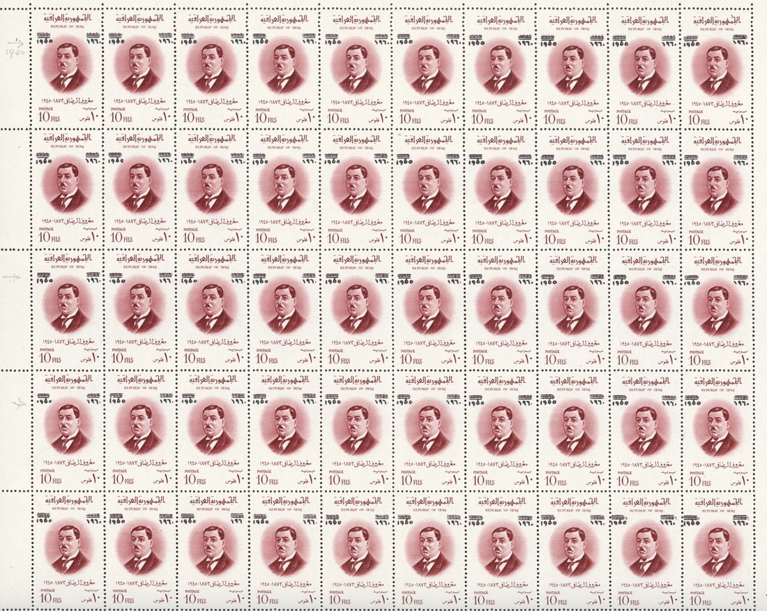 1960 Al Rasafi 10f. lake, complete sheet of fifty (10 x 5), number 43 variety Arabic "196" for "1960", also examples with inverted overprint mint and used and double overprint mint; fine. S.G. 539, 539a, 539b