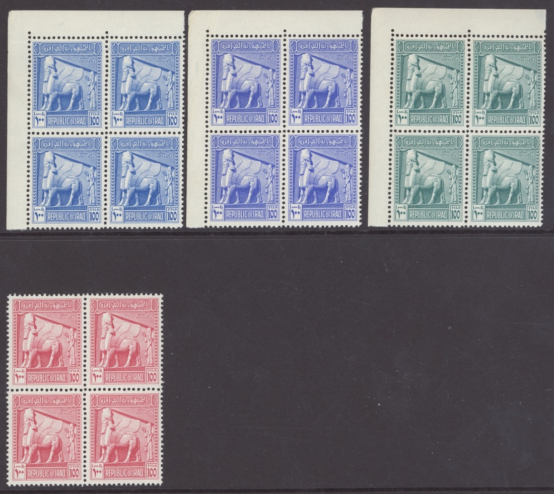 1962 (c.) 100f. Winged Bull of Kharsabad, large format Essays in four different colours, each in a perf. block of four, unmounted mint, a few bends or creases, fine. A scarce and attractive group