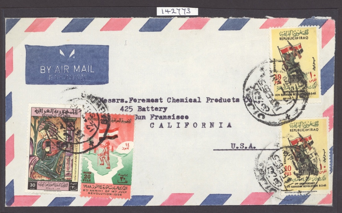 1965 Second Anniversary of the Revolution 10f., variety black printed double, with normal, 1964 Revolution 20f. and 1964 Music 30f. on Air Mail cover to California, R.P.S. Certificate (1987), also 1965 U.I.T 20f. with red double. S.G. 672a, 684 var.