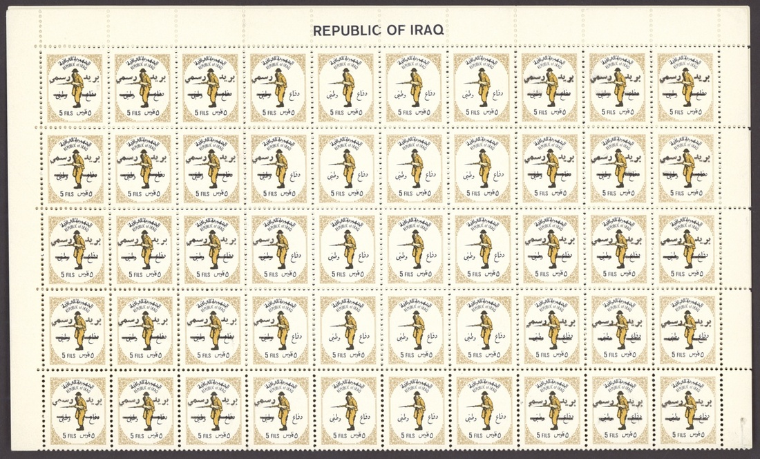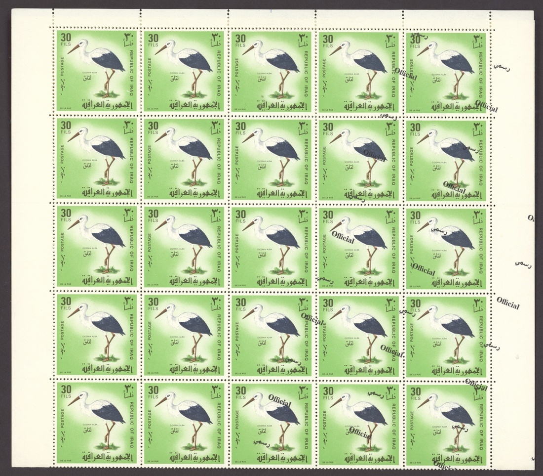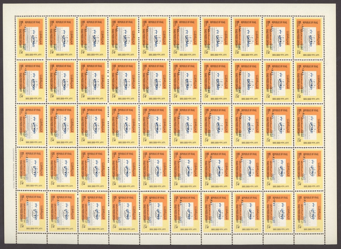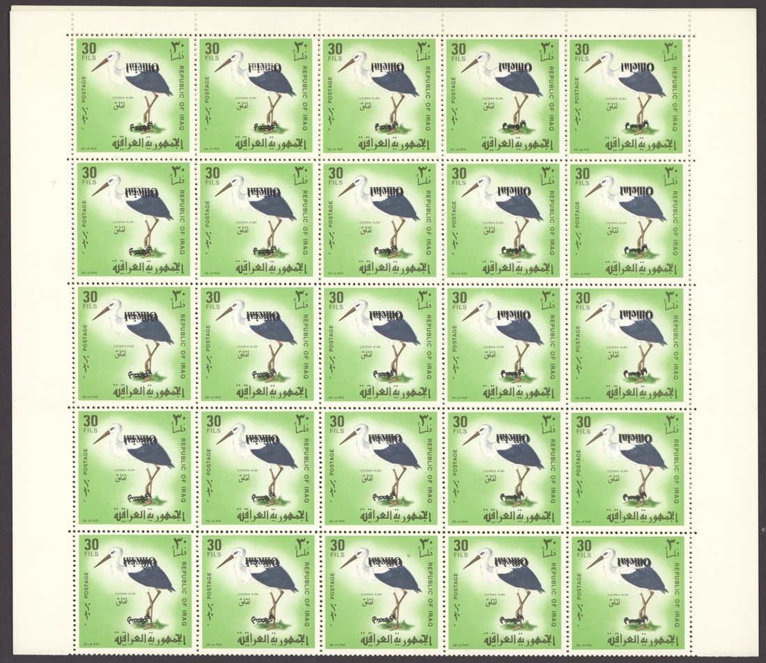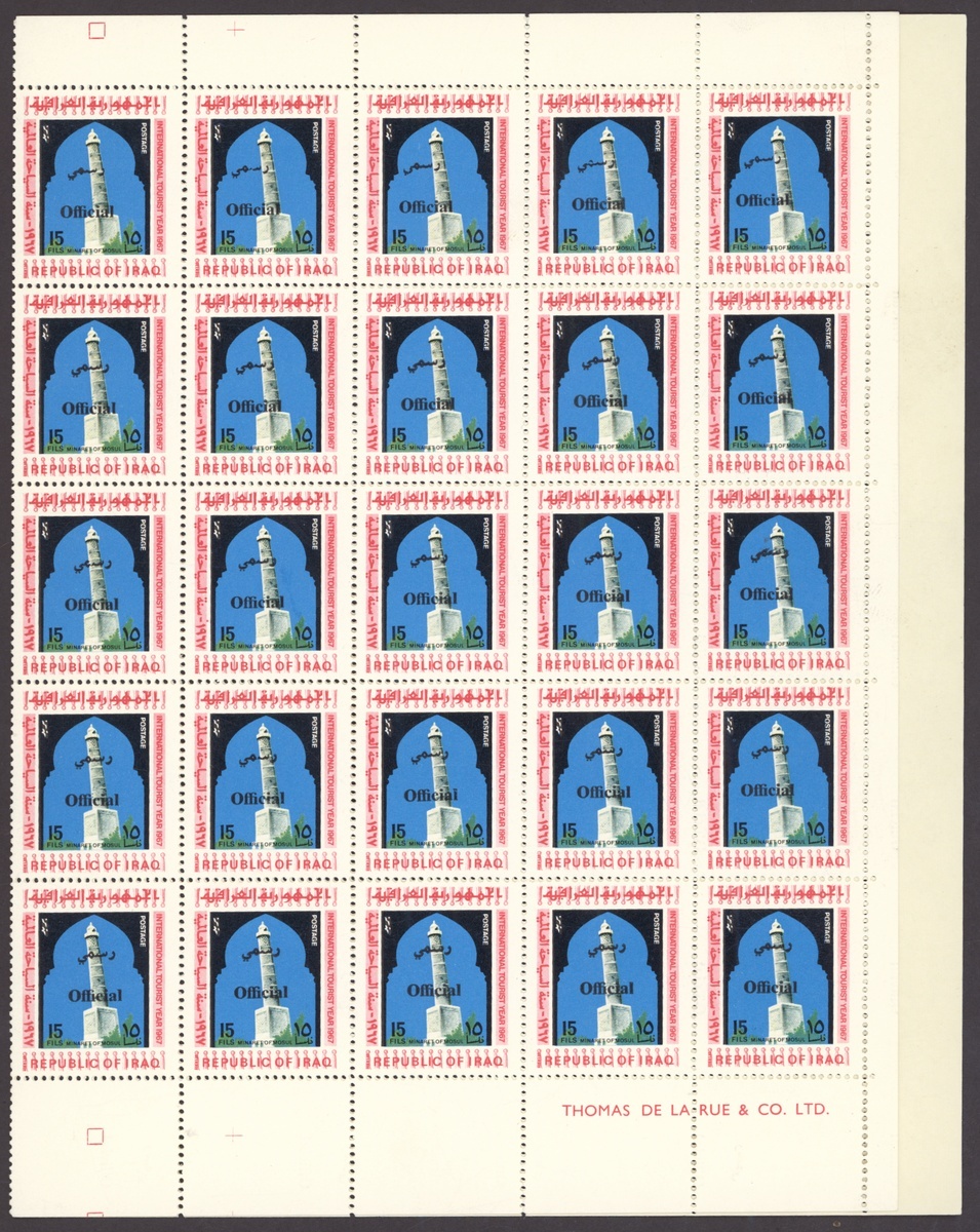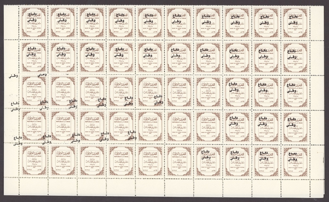 1967 Obligatory Tax, Defence Fund 5f. brown, complete sheet of 100, the lower three rows with misplaced overprint resulting in 10+ with no overprint, 1974 Obligatory Tax, Defence Fund 5f. black, yellow and olive, complete sheet of 100, the 5th., 6th. and 7th. vertical rows without overprint, 1975 Official 15f. sheet of 50, twenty five with overprint double, one sideways, 30f. sheet of fifty with overprint diagonal resulting in sixteen without overprint, 30f. sheet of fifty, all variety overprint double, both inverted; unmounted mint, sheets folded in places, chiefly good to fine. An unusual group. S.G. T764, T1158, O1177, O1178, O1178b