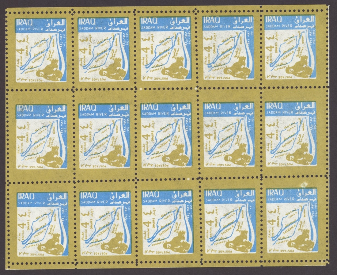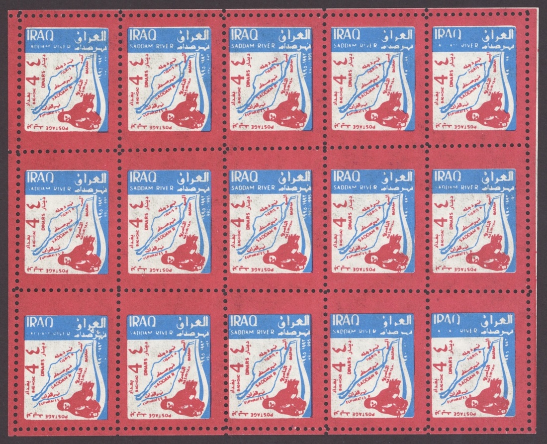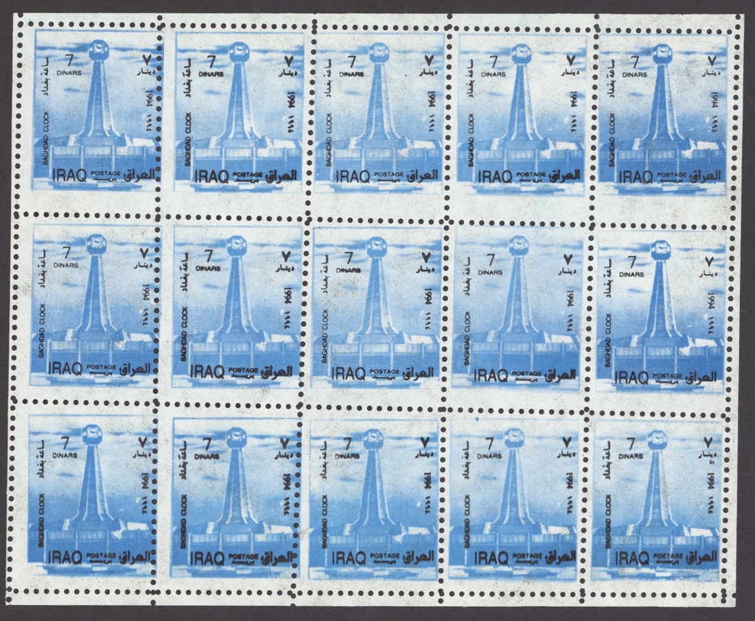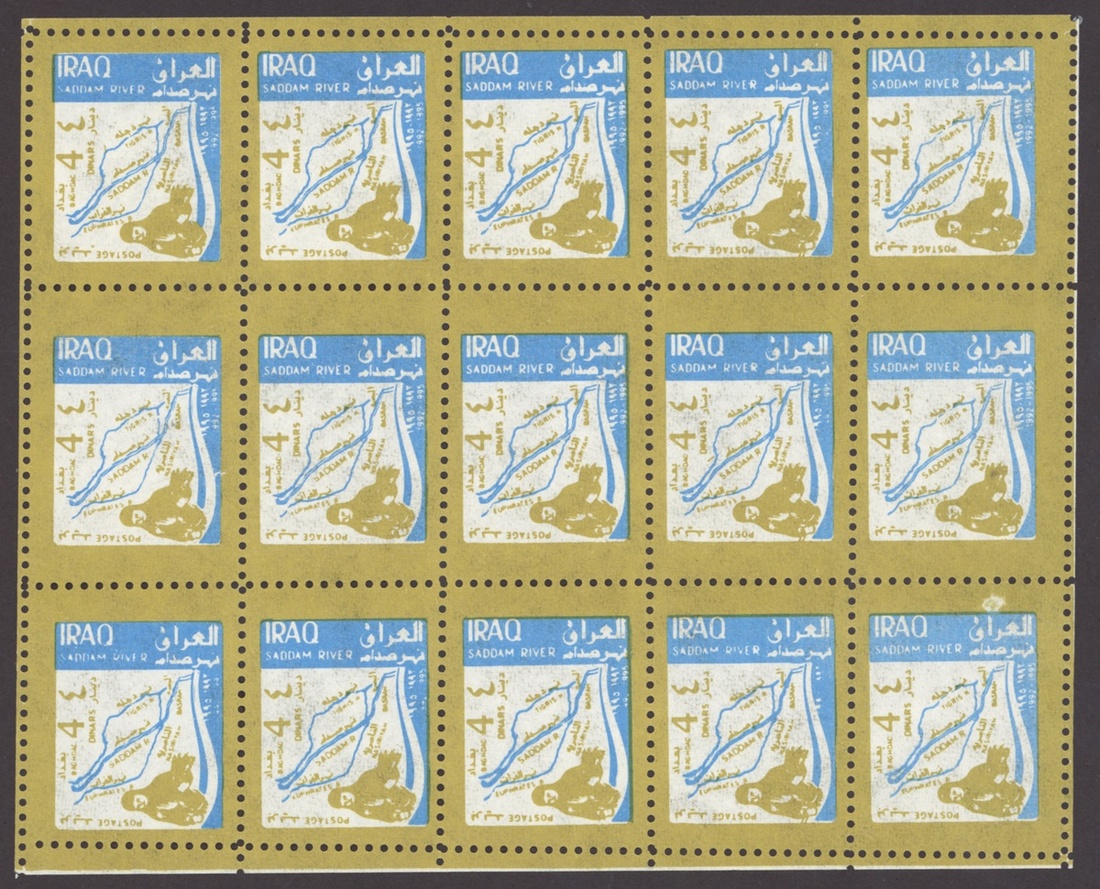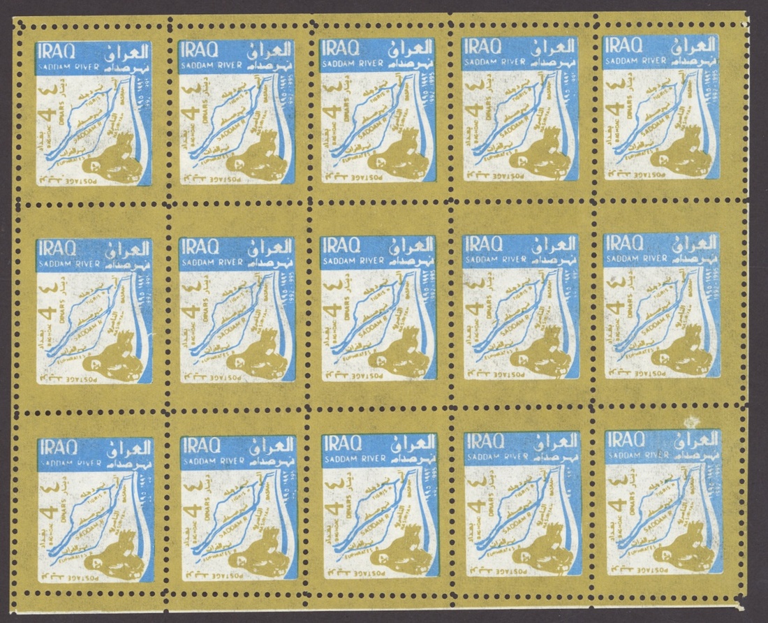 1994 Al Qaid Bridge, sheet of 120 containing 1d. and 3d. (45 each) and 1d. and 3d. se-tenant pairs (15), 1997 Baghdad Clock 7d. (236, mostly in sheetlets of 15), 1995 Saddam Tower sheet of 120 containing 2d. and 5d. (45 each) and 2d. and 5d. se-tenant pairs (15), 1995 Completion of Saddam River 4d. (both) 101 of each, mostly in sheetlets of 15; fine. S.G. 1969-1970, 1974, 1976-77, 1979-1980, £3,200