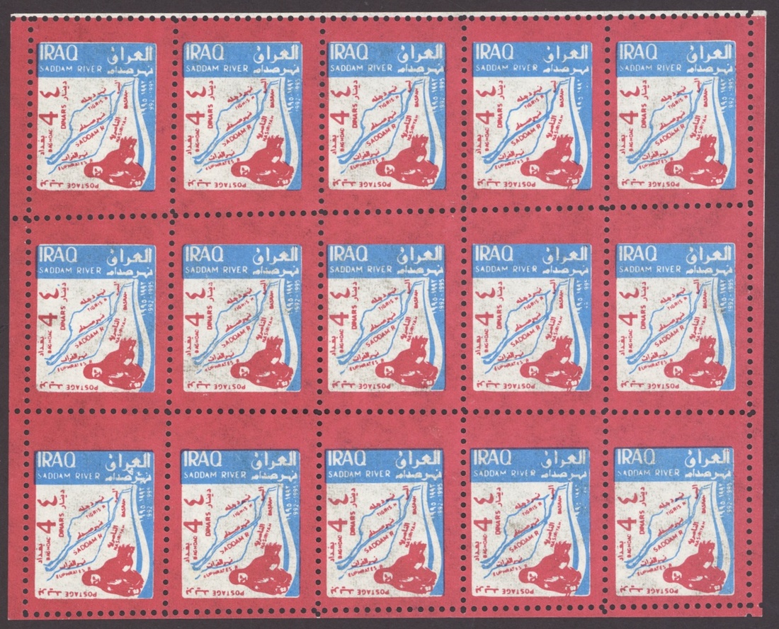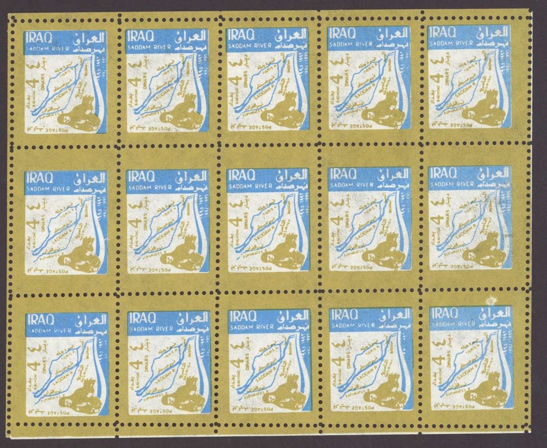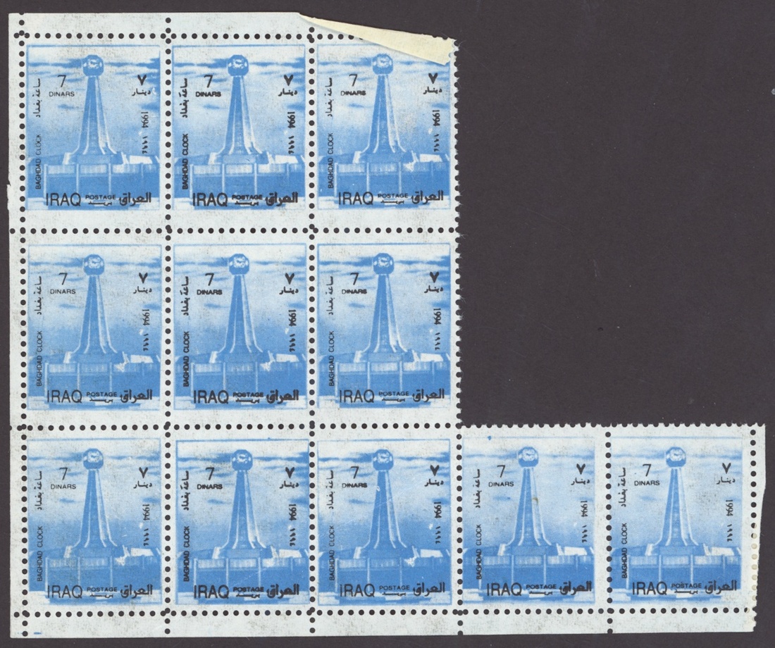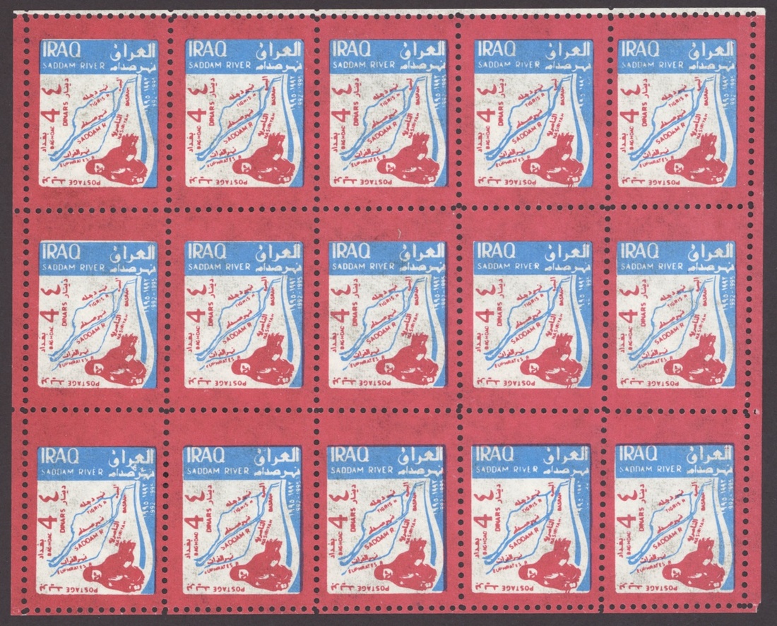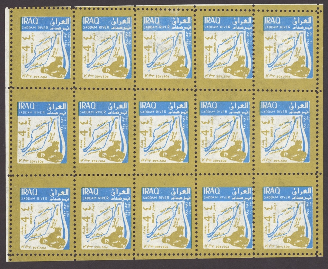 1994 Al Qaid Bridge, sheet of 120 containing 1d. and 3d. (45 each) and 1d. and 3d. se-tenant pairs (15), 1997 Baghdad Clock 7d. (236, mostly in sheetlets of 15), 1995 Saddam Tower sheet of 120 containing 2d. and 5d. (45 each) and 2d. and 5d. se-tenant pairs (15), 1995 Completion of Saddam River 4d. (both) 101 of each, mostly in sheetlets of 15; fine. S.G. 1969-1970, 1974, 1976-77, 1979-1980, £3,200