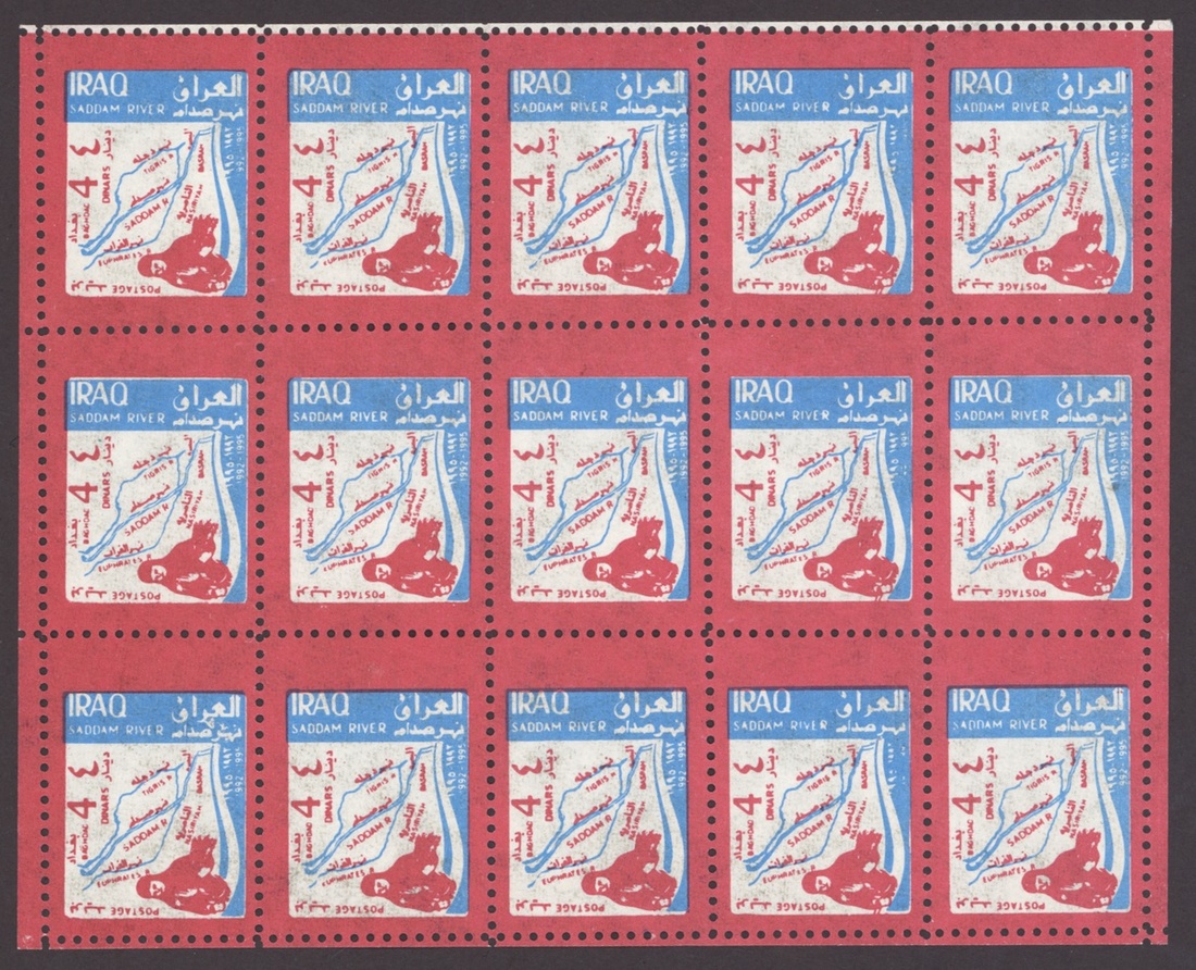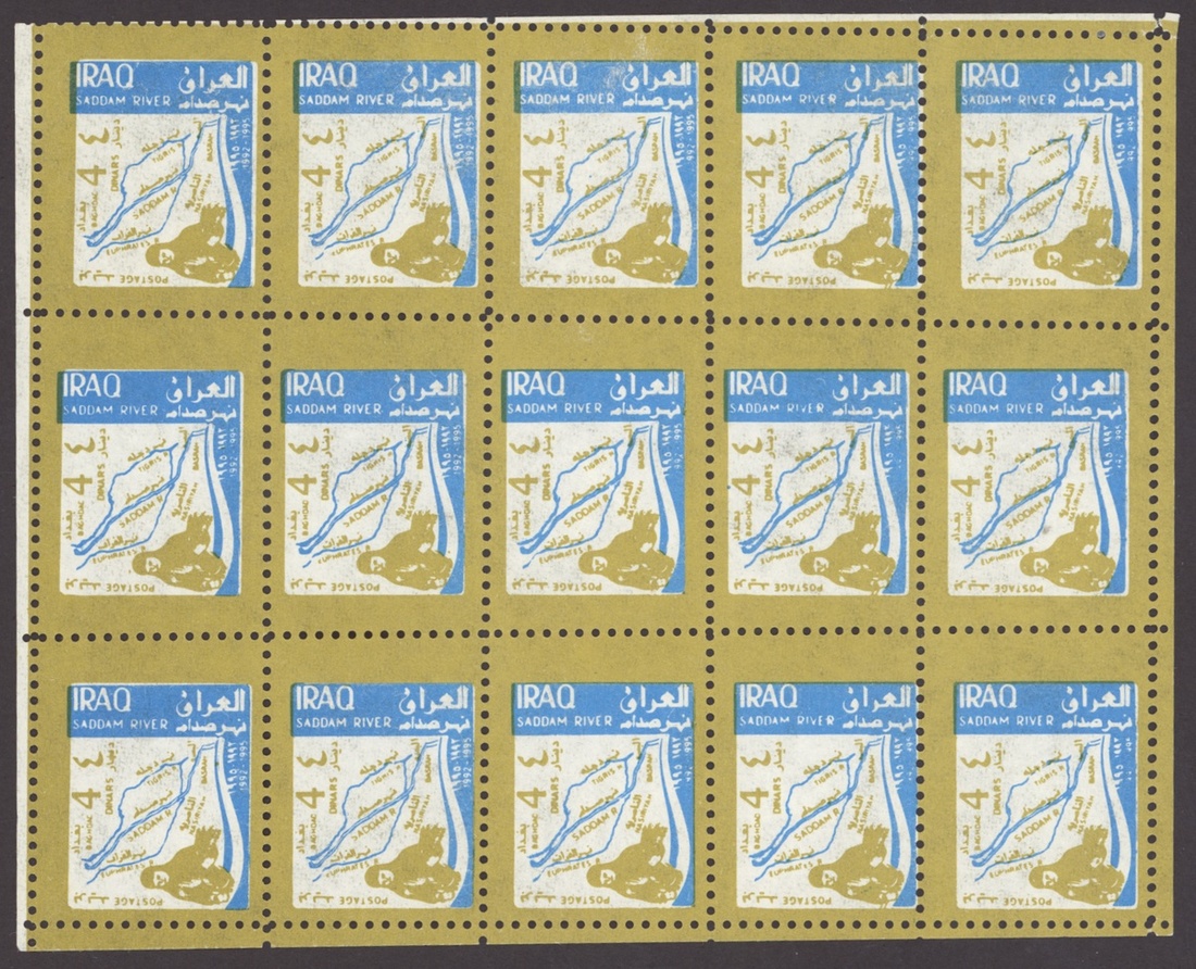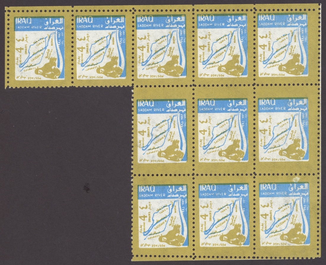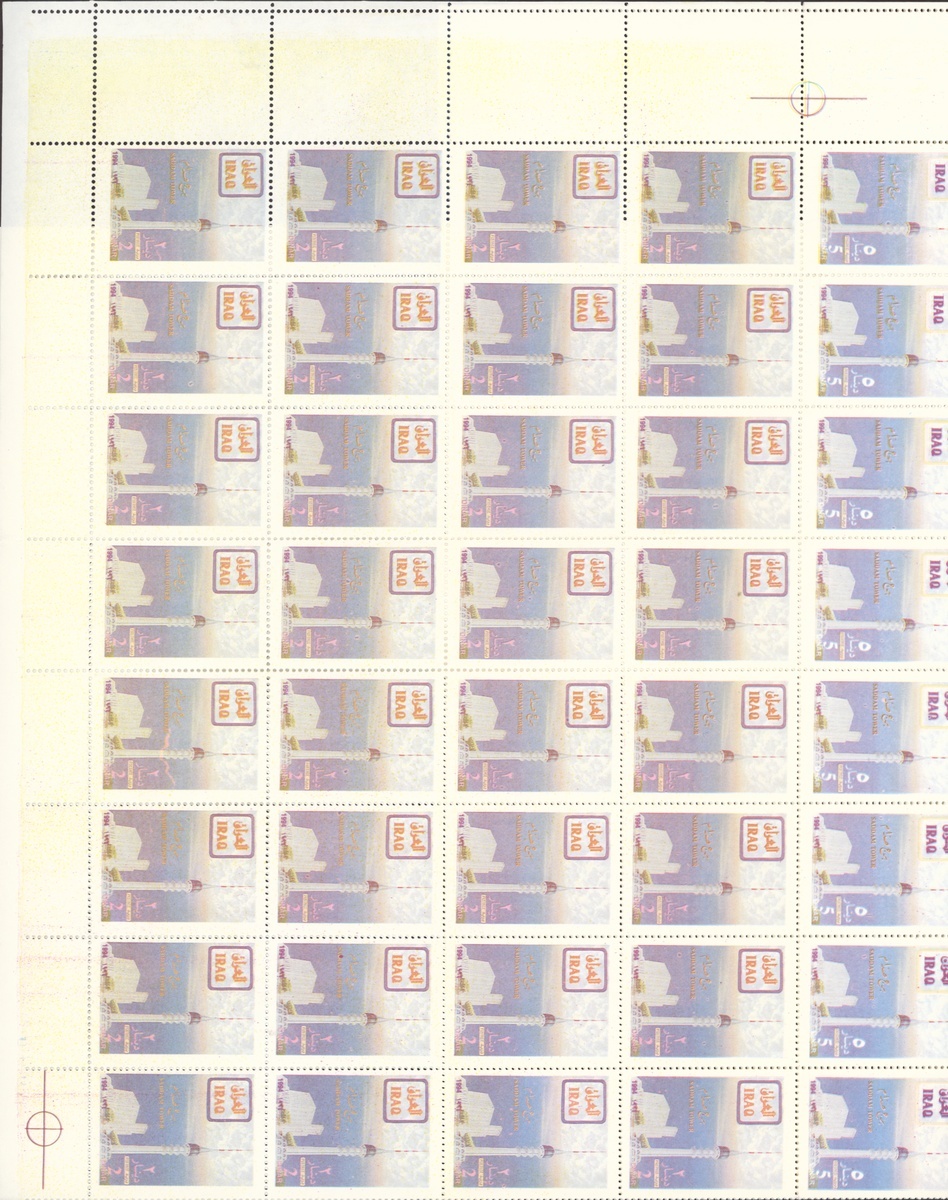 1994 Al Qaid Bridge, sheet of 120 containing 1d. and 3d. (45 each) and 1d. and 3d. se-tenant pairs (15), 1997 Baghdad Clock 7d. (236, mostly in sheetlets of 15), 1995 Saddam Tower sheet of 120 containing 2d. and 5d. (45 each) and 2d. and 5d. se-tenant pairs (15), 1995 Completion of Saddam River 4d. (both) 101 of each, mostly in sheetlets of 15; fine. S.G. 1969-1970, 1974, 1976-77, 1979-1980, £3,200