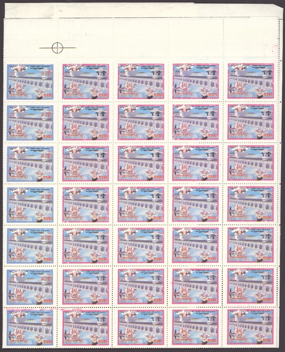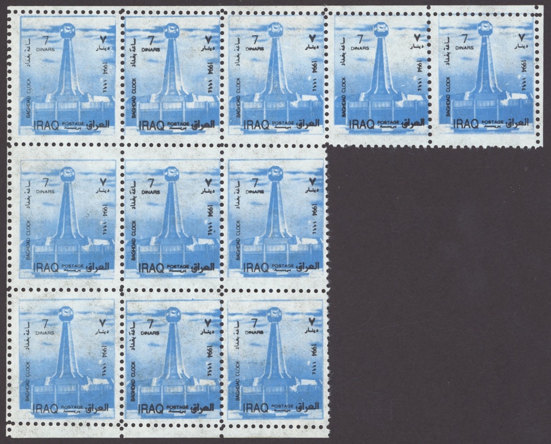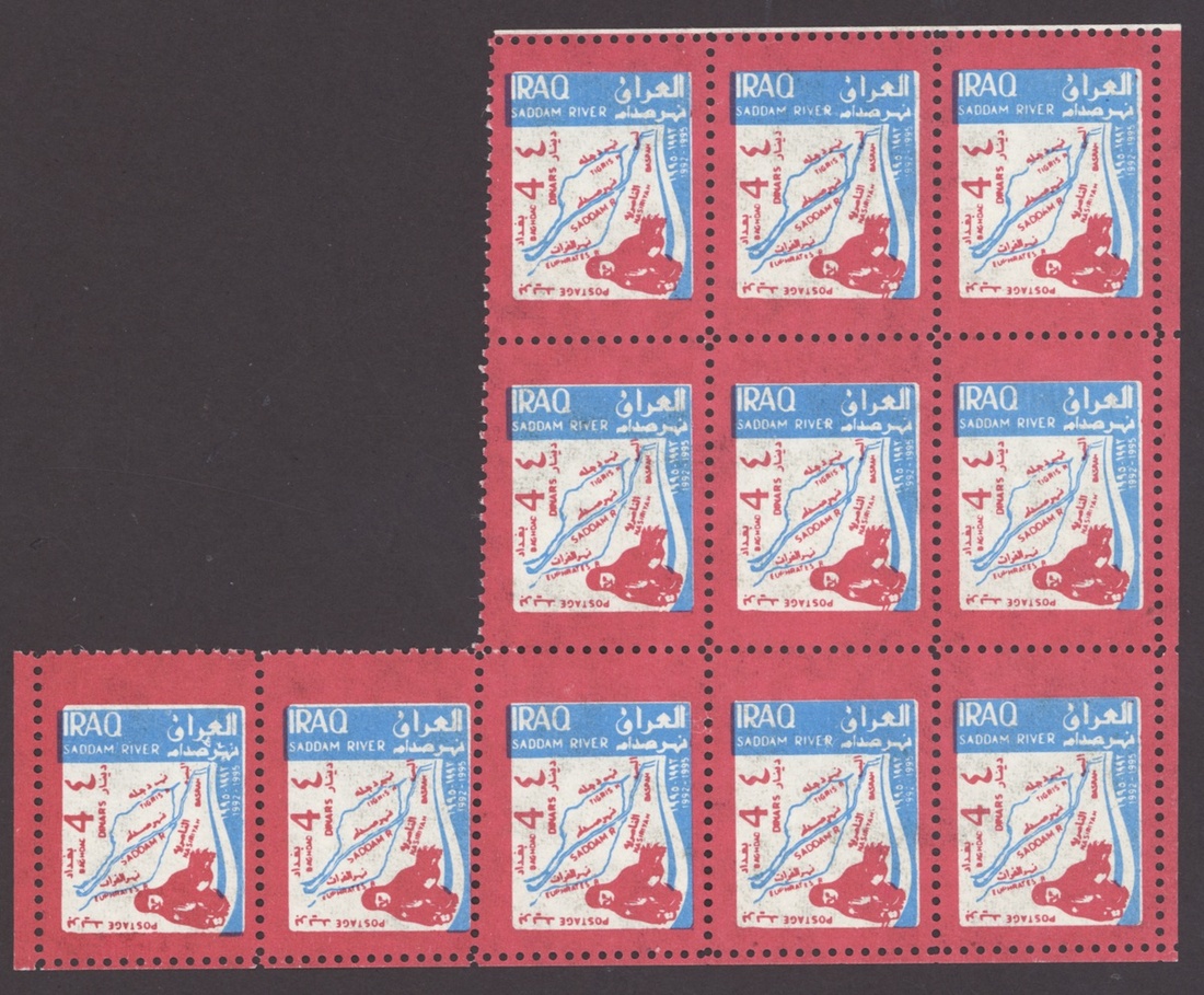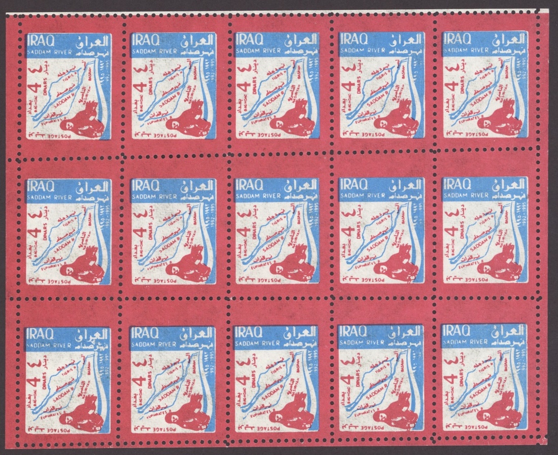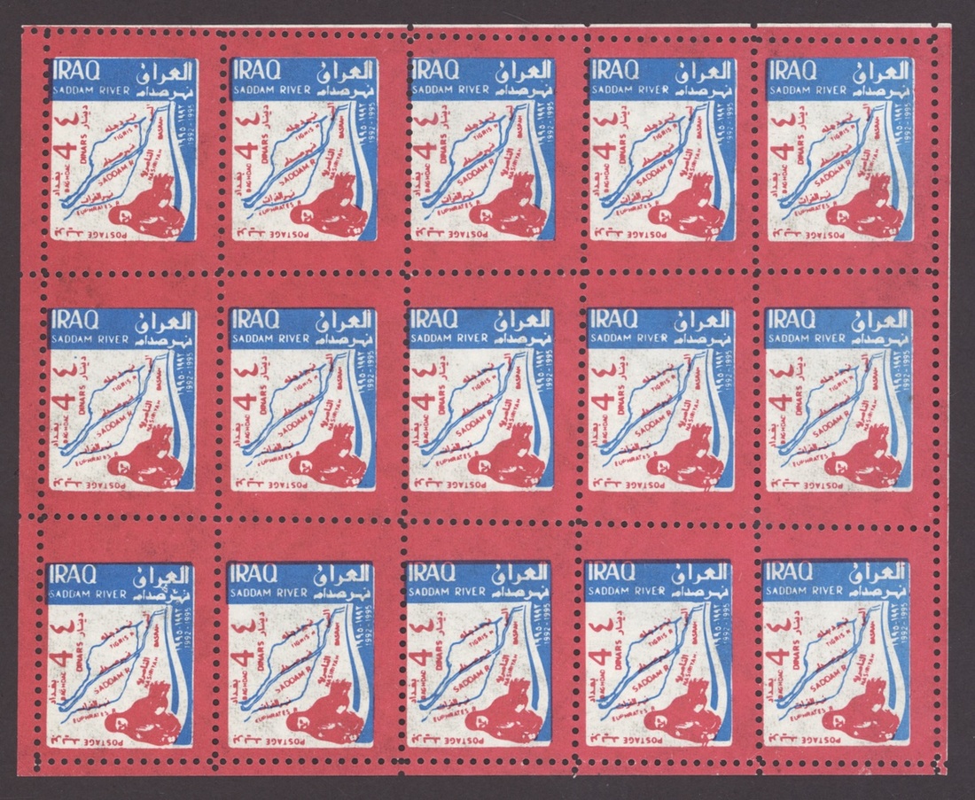 1994 Al Qaid Bridge, sheet of 120 containing 1d. and 3d. (45 each) and 1d. and 3d. se-tenant pairs (15), 1997 Baghdad Clock 7d. (236, mostly in sheetlets of 15), 1995 Saddam Tower sheet of 120 containing 2d. and 5d. (45 each) and 2d. and 5d. se-tenant pairs (15), 1995 Completion of Saddam River 4d. (both) 101 of each, mostly in sheetlets of 15; fine. S.G. 1969-1970, 1974, 1976-77, 1979-1980, £3,200