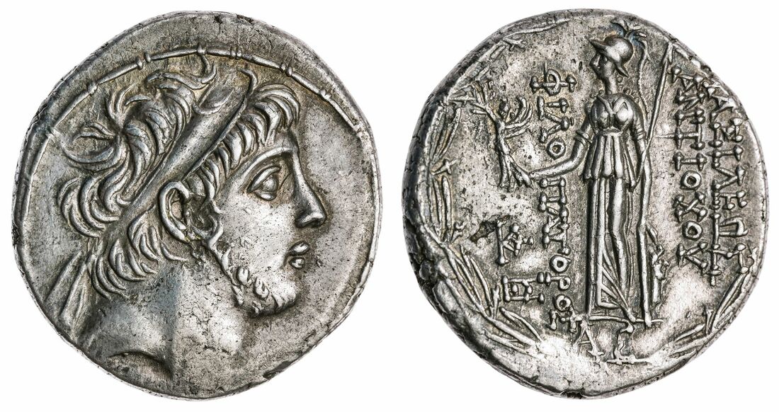 Seleukid Kingdom of Syria, Antiochos IX Kyzikenos (115-96 BC) AR Tetradrachm, Damascus, dated SE 201 = 112/11 BC, Diademed head right, rev. BASILEOS ANTIOXOY PHILOPATOROS Athena Nikephoros standing left, resting left hand on shield, spear behind, all within laurel wreath border, 16.40g (SC 2381.3) Detailed and lustrous, slight flattening to reverse but otherwise about good very fine
