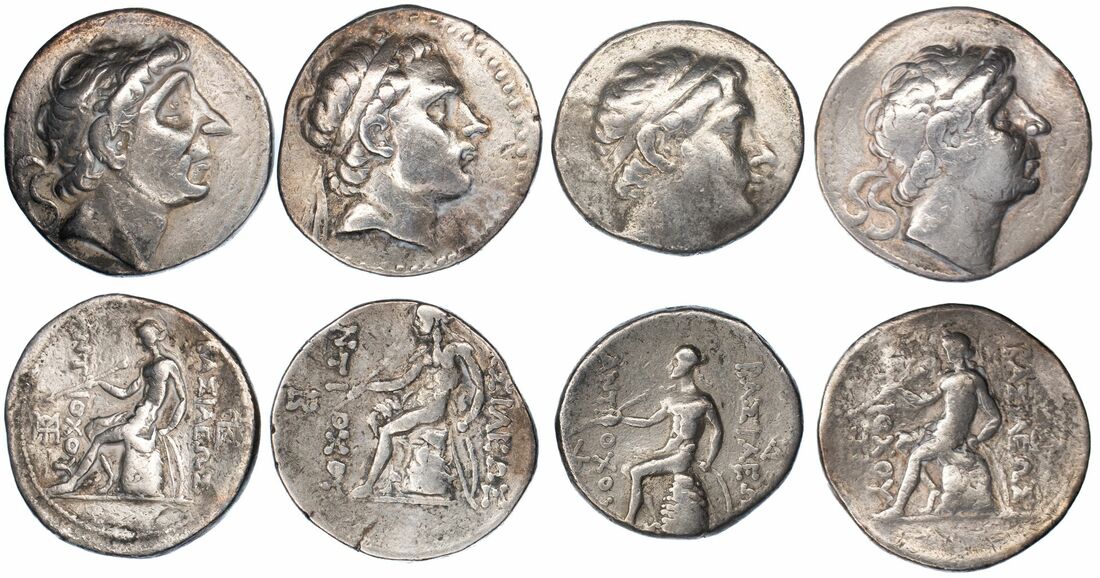 a Group of Seleukid Tetradrachms (4): Antiochos I Soter (2): i) two monograms to outer fields, 16.78g, wear and deposits to lower reaches, good to fine; ii) another, as before, with one monogram within circle to right field, 16.88g, worn to edges of reverse, good to fine; Antiochos III, 'the Great' (223-183 BC) (2): iii) one monogram to left outer field 16.76g, bold portrait, softened reverse, good to fine; iv) a before, a monogram to each outer field, 16.72g, light porosity, fine; (4)