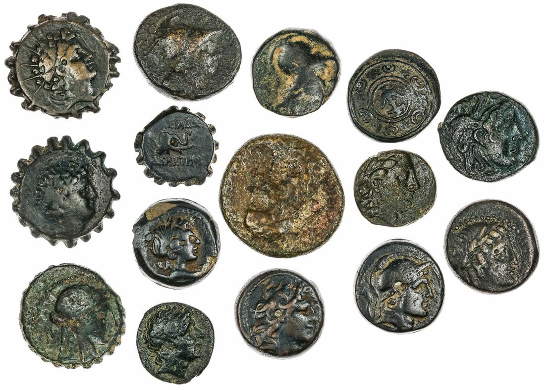 A Selection of Seleukid Bronze (14) including Antiochos II Theos (261-246 BC), AE17, Antioch on the Orontes, Laureate head of Apollo right, rev. BASILEOS ANTIOCHOY, Apollo on omphalos resting elbow on cithara, 4.32g (SC 572; HGC 9, 266); Seleukos IV Philopator (187-175 AD), AE22 serrated, bust of Apollo right, rev. Apollo standing left leaning on tripod holding arrow, 8.03g (SC 1315.6n; HGC 9, 584); Antiochos VI Dionysos (144-142 BC), AE 22 serrated, Antioch on the Orontes mint, Radiate and wreathed head right rev. Elephant standing left, holding torch with trunk, 7.72g (SC 2006b; HGC 9, 1043); various other types, fine to very fine