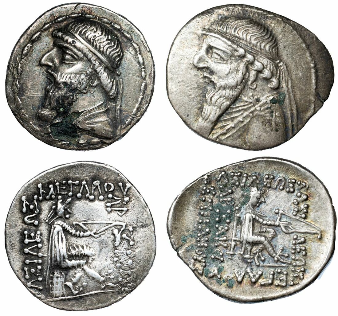 Kingdom of Parthia, Mithradates I (171-138 BC), Drachm, 3.83g, Mithradates II (123-88 BC), Drachm, 4.12g. both with diademed and draped bust left with long beard, rev. archer seated left with Greek legend around (Sell.11, 27; Shore 24, 85), the first with flan fault below bust, otherwise both very fine (2)