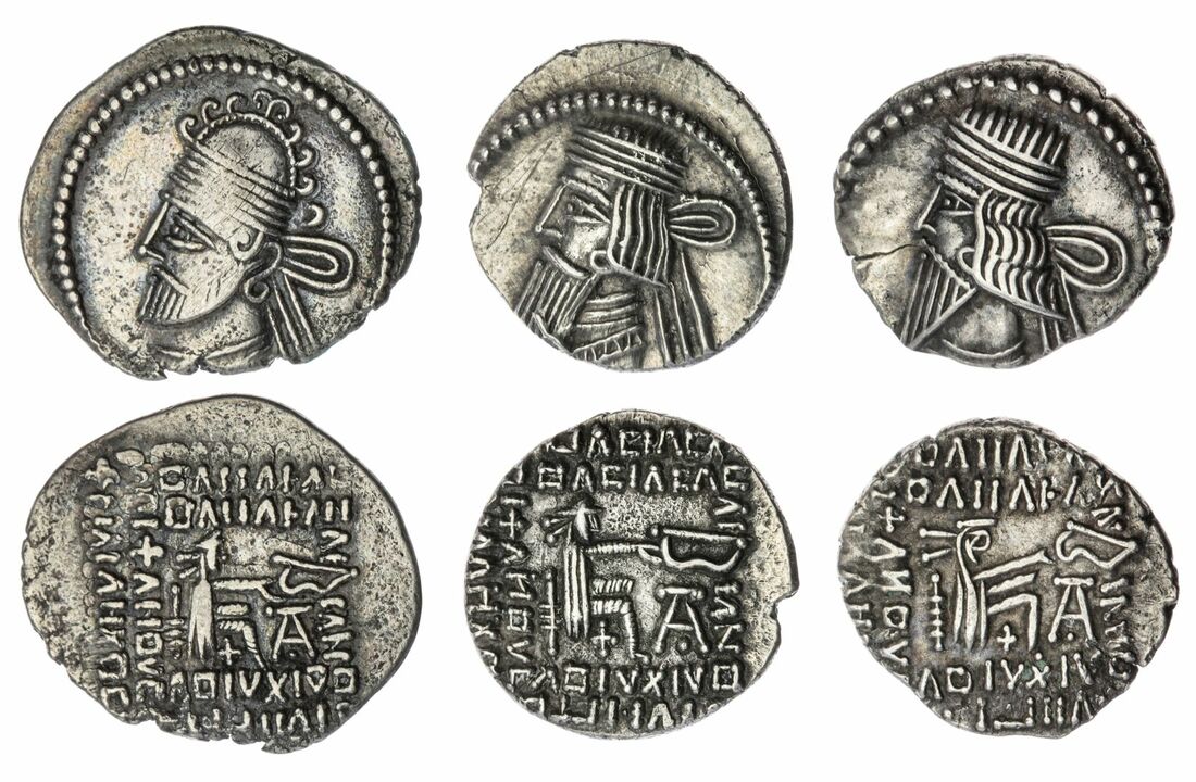 (x) Kingdom of Parthia, Artabanos IV (c. AD 10-38), Drachm, diademed bust left, rev., archer seated right on throne (Sellwood 63.6 (Artabanos II); Sunrise 412; Shore 341-3 (Artabanos II)), scratch in obverse field, good very fine; Pakoros I (c. 78-120), Drachm, similar, but king wears a tiara (Sellwood 77.8 ; Sunrise 434; Shore 399), some scratches on tiara, about very fine; Mithradates V (c. 128-147), Drachm, similar to first (Sellwood 82.1 (Mithradates IV) ; Sunrise 450; Shore 425 (Mithradates IV)), with obverse flan crack in field, but otherwise very fine (3)